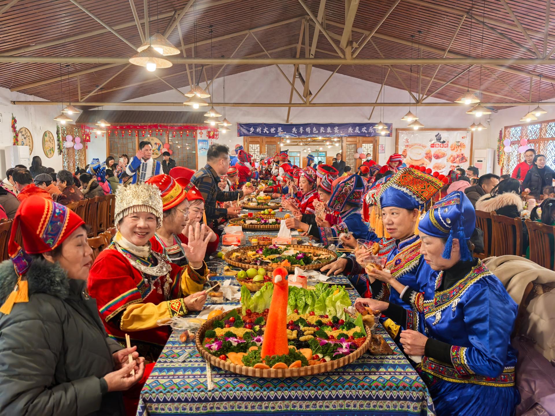 在乡村大世界,特色长桌宴活动吸引一众市民游客参与,长桌上摆满特色风味美食,市民游客共叙情谊,绘就一幅民族交往交流交融的生动图景;同时,对山歌、竹竿舞、抛绣球等系列民族特色活动将活动氛围推向高潮,一场精彩的视听盛宴获得市民游客纷纷称赞。