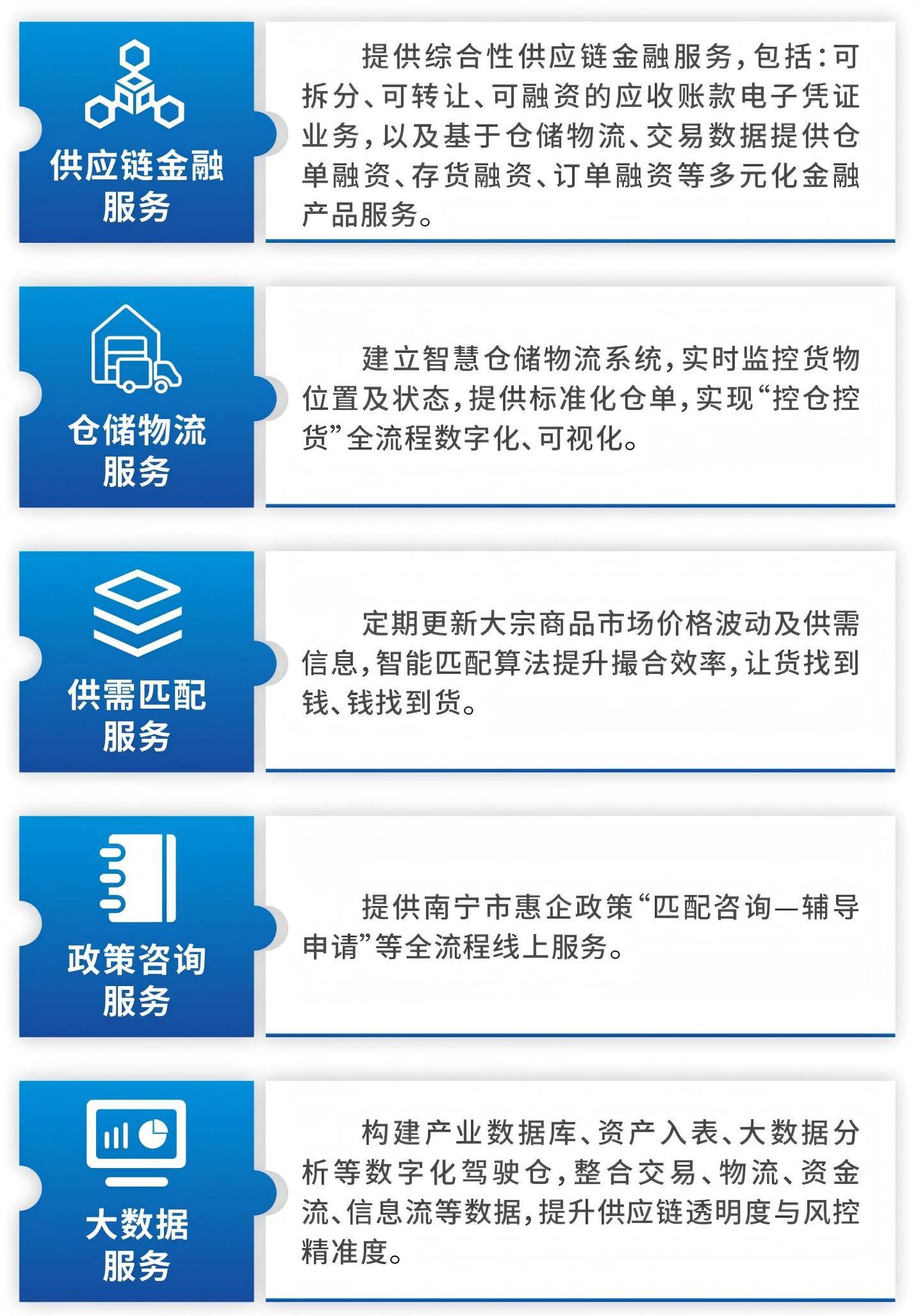 “邕链通”究竟有哪些“硬核”实力?作为企业的“贴心助手”,它在产业服务与金融服务两端发力:智能交易匹配能快速对接农产品、工业品供需;高效集采集销降低采购成本、拓宽销路;智慧仓储物流为跨境贸易全程护航。金融服务更是亮点十足 ——“物的信用”实现“C位出道”!让货物都能拥有自己的“数字身份证”;白糖、铝等商品存货可转化为仓单融资,真实交易数据能申请纯信用贷款,应收账款也能灵活流转,助力企业资金高效周转。