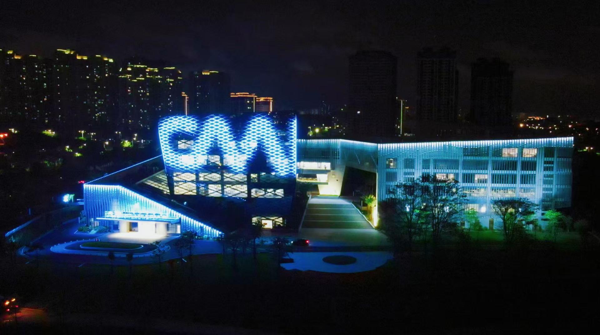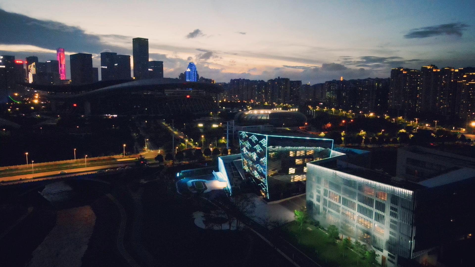自项目启动以来,施工团队认真完善每一处光影细节——在建筑中部大型玻璃体表面,轨道线条灯纵横铺陈,通过RGB色彩控制系统的编程调试,让整片玻璃幕墙在夜间变为可动态变幻的巨型“智能画布”;建筑两侧主体幕墙采用泛光照射技术,以科技蓝为主色调的光束均匀晕染。