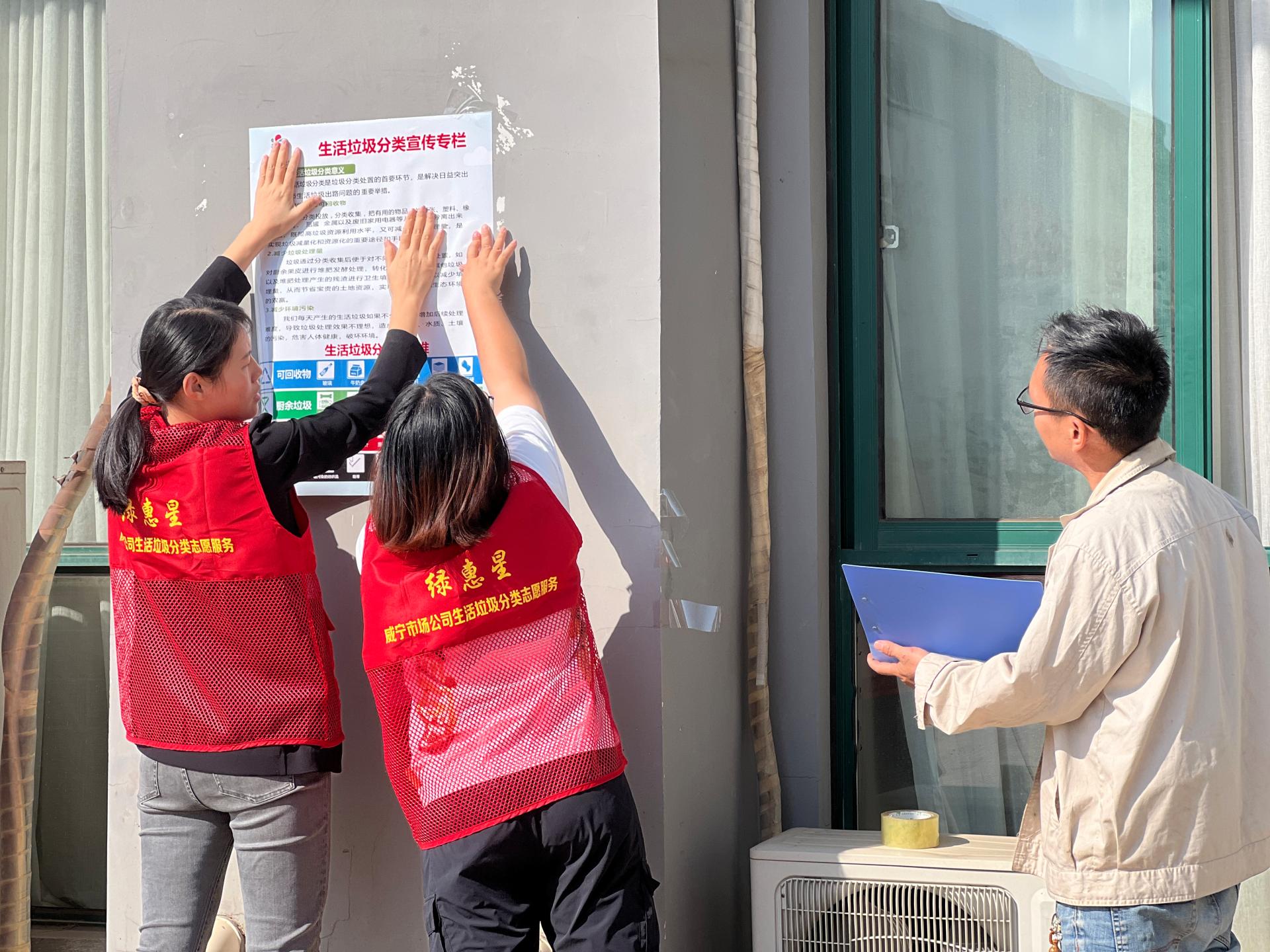 志愿者们在粮库内张贴垃圾分类宣传海报