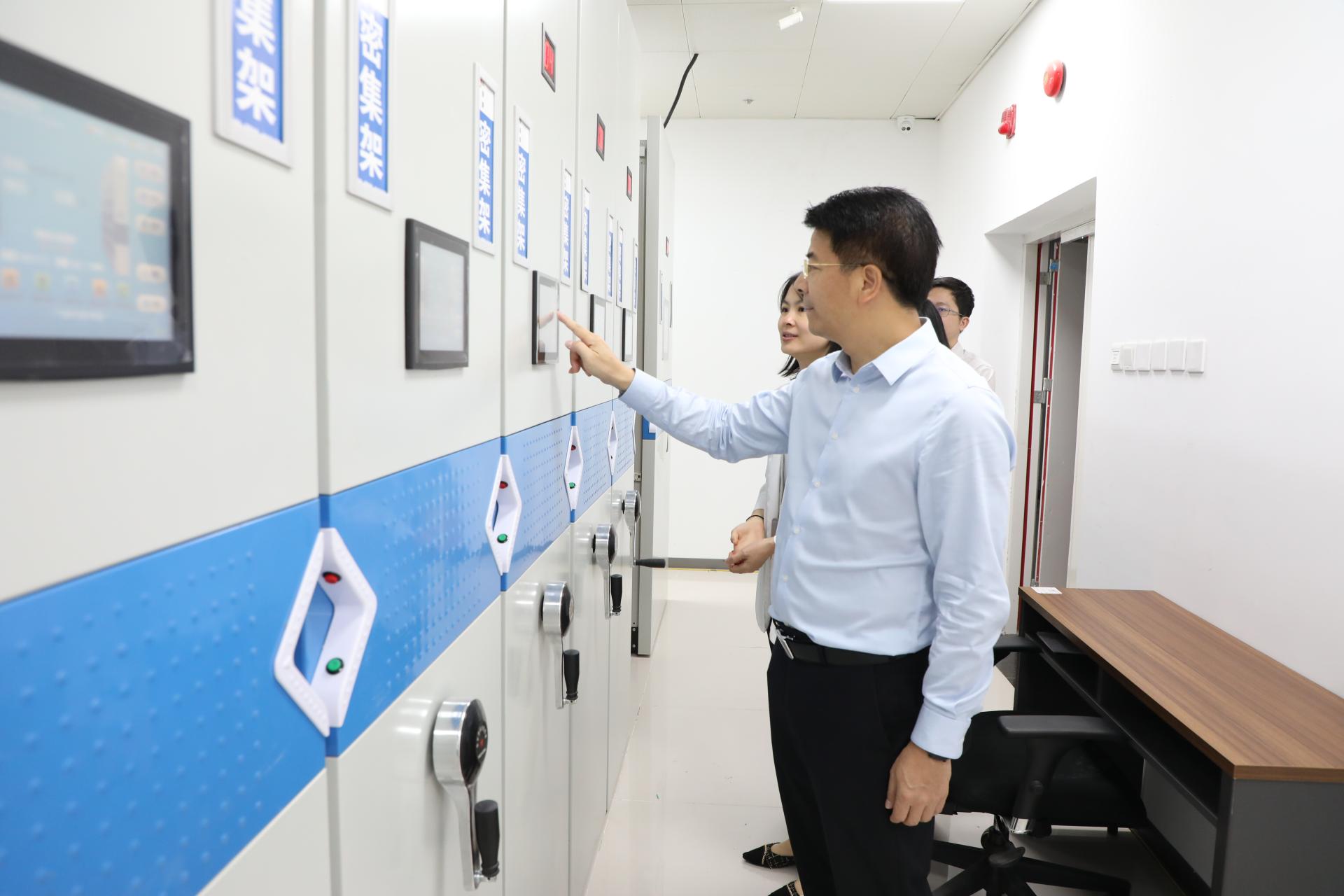 检查中,韦义勇到档案管理中心先后检查档案整理室、档案库房及档案阅览室,并听取档案工作人员关于档案用房、硬件设施设备及2022年度档案整理等方面工作情况的汇报。