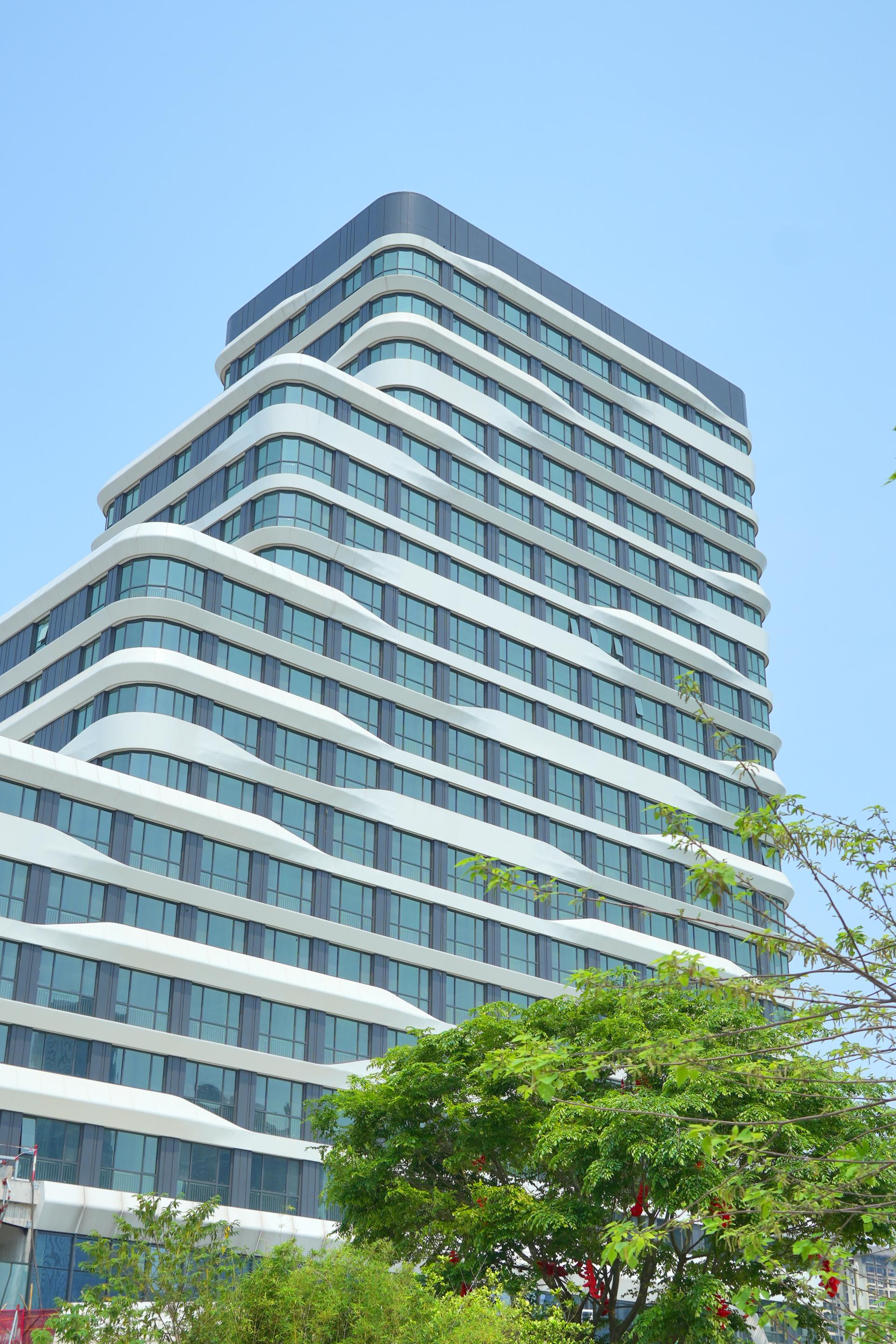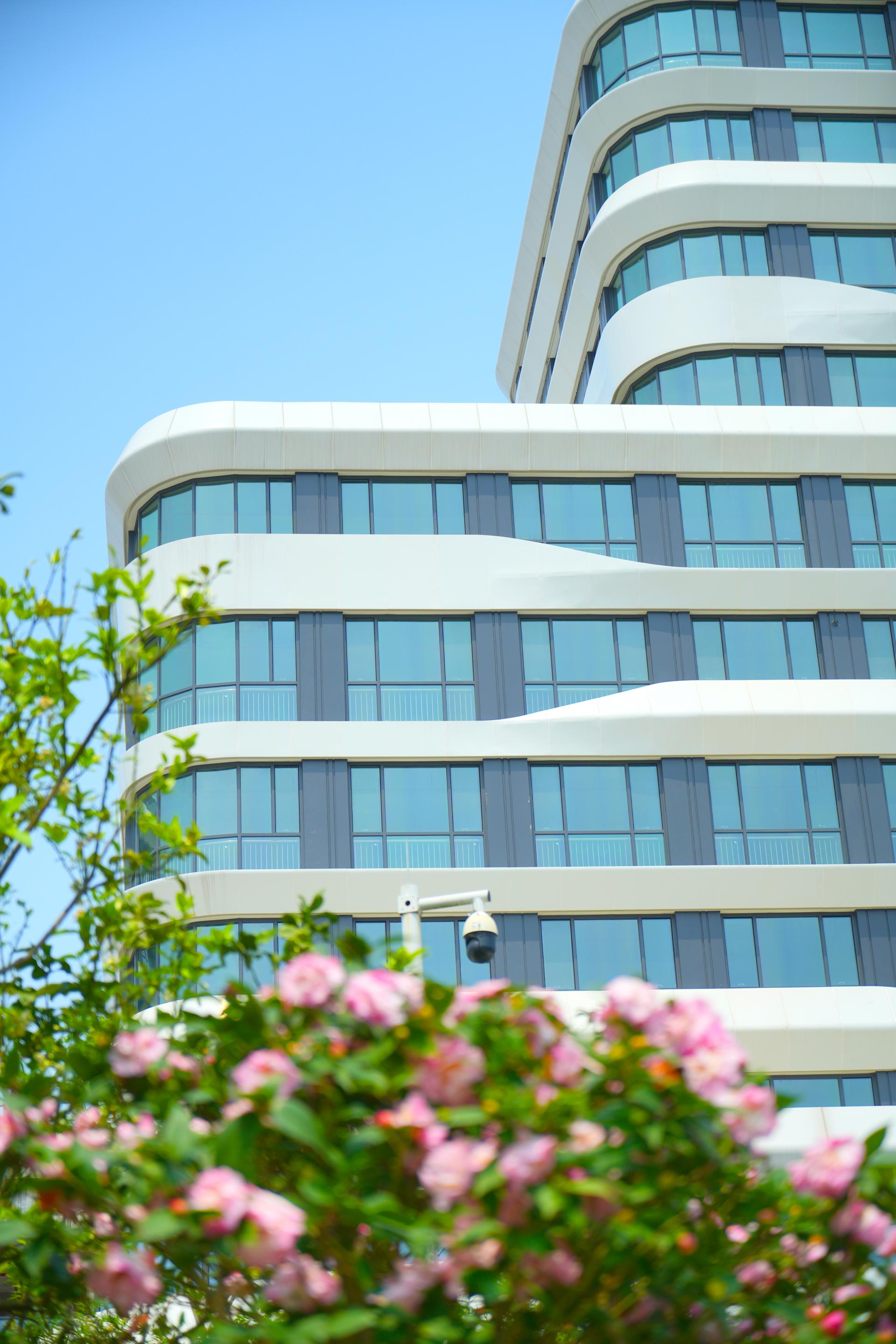 验收当天阳光明媚,在蓝天白云映衬下的东盟乐鱼(中国)文创中心,屹立于广西文化艺术中心之侧,两处建筑交相辉映。项目各个楼栋绵延相连,犹如不断延伸的山峦,外立面上白色海浪式的设计,让人赏心悦目,引来市民游客纷纷驻足拍照打卡。