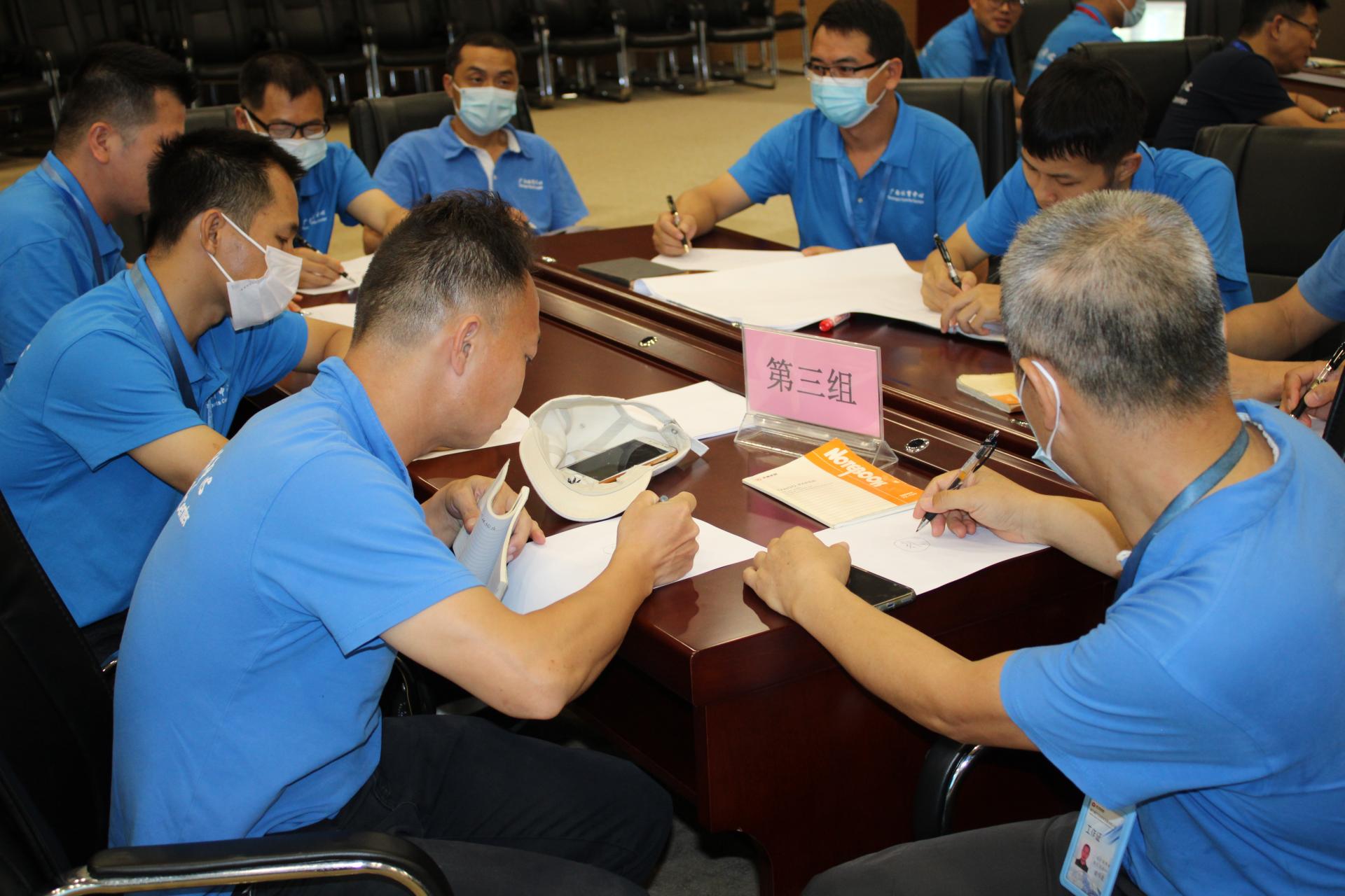 培训过程中,全体学员踊跃参与,配合现场模拟演示,大家全情投入,讨论热烈,现场学习氛围浓厚。在小组展示环节中,各个小组活学活用,不同切入点,各有风格……运行保障部学员在演练过程中,将理论学习与实际应用相结合,而场馆管理部学员则在思维导图的描绘方法上保留了电工工种的特色——思维导图画得像电路板!