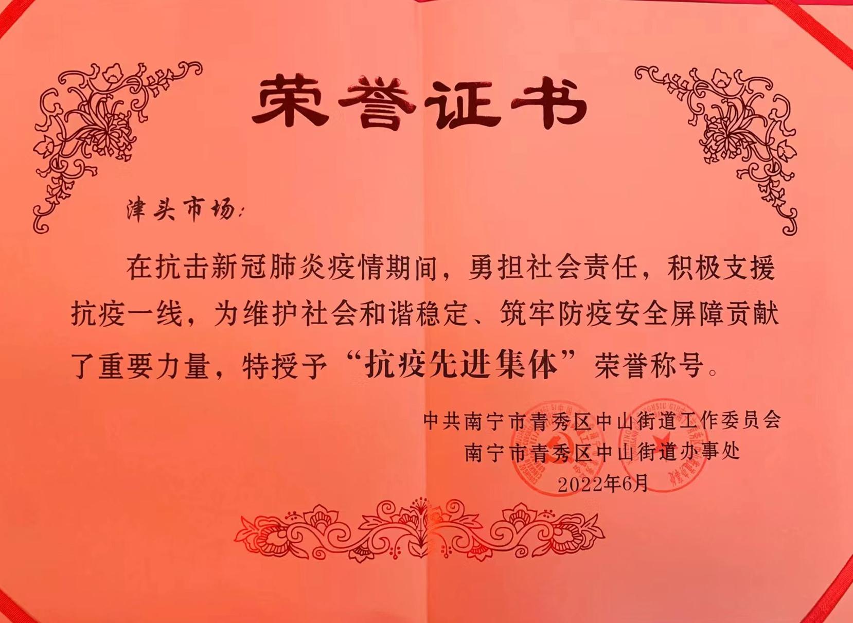 近日,为表彰在抗击新冠肺炎疫情中的突出贡献,南宁市青秀区中山街道办授予乐鱼(中国)市场公司经营管理的津头市场“抗疫先进集体”称号。