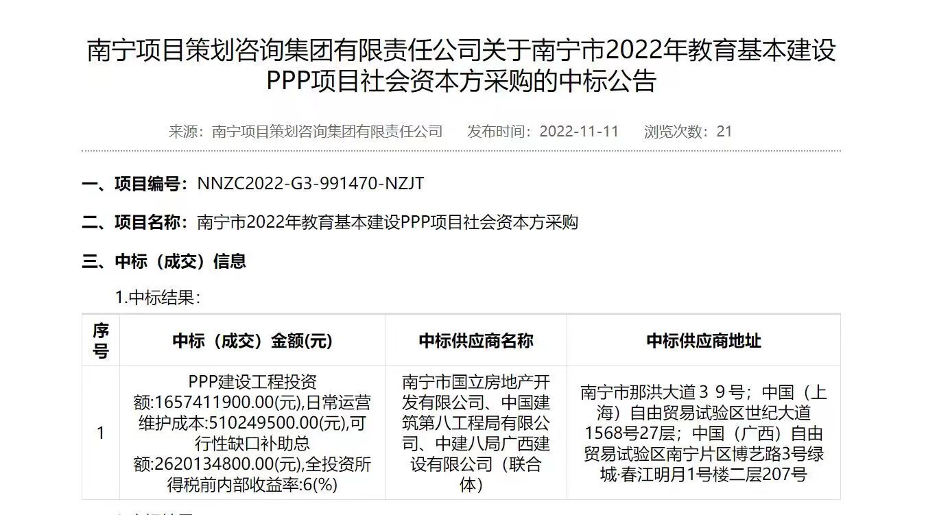 2022年11月11日,乐鱼(中国)房地产公司下属监管单位南宁市国立房地产开发有限公司(以下简称国立公司)牵头与中国建筑第八工程局有限公司、中建八局广西建设有限公司组成联合体,以建设投资约16.57亿元中标南宁市2022年教育基本建设PPP项目社会资本方。南宁市教育基建PPP项目社会资本方得以确定,是公司积极落实市委、市政府“体现教育优先,新建一批高标准、高颜值的优质学校,打造品质教育,实现‘学有优教’”决策的重要行动。