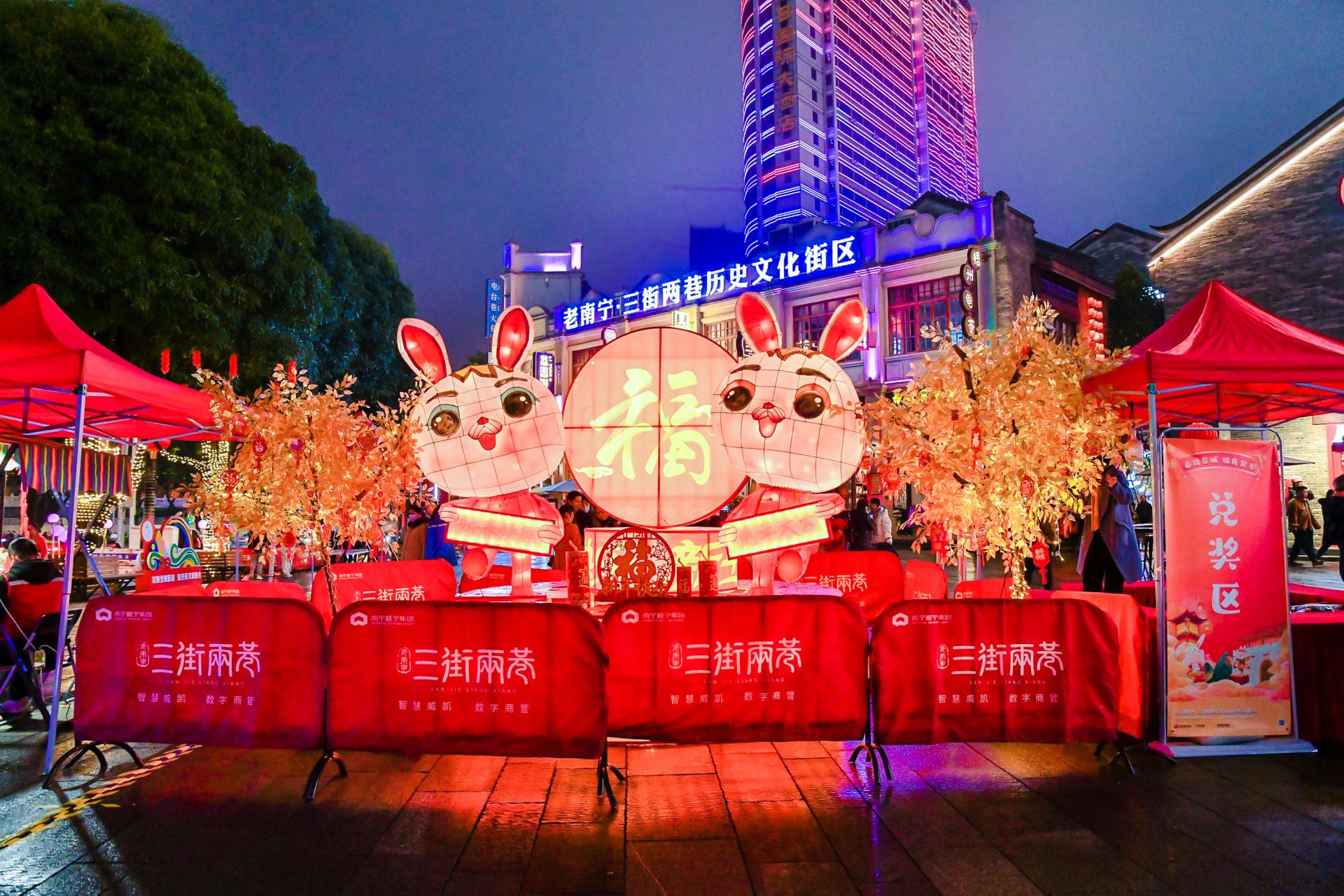 活动现场,花灯华彩、灯笼高挂,六组“春嬉邕城 鸿兔贺岁”为主题花灯作品受到市民游客的青睐。新春花灯寓意新年红火,平安如意,是春节传统佳节的重要文化载体,中华大戏院、城隍庙、仓西门城楼的大型花灯,吸引路上行人纷纷拍照合影留念。据悉,南宁元宵花灯节2014年入选第五批自治区级非物质文化遗产代表性项目名录。三街两巷新春花灯是由广西壮族自治区级非物质文化遗产《恭城彩扎》传承人、工艺美术师张桦创作,与三街两巷历史文化和新春元素相结合,花灯技艺精巧,活灵活现,尽显工匠智慧和技能,打造了上承非遗、下启新章的花灯景观。