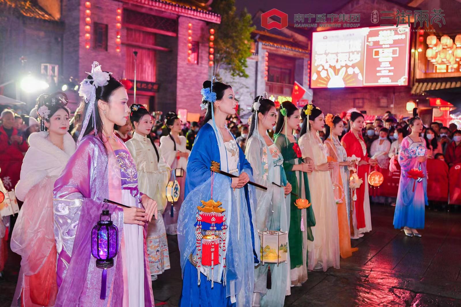 2月5日,三街两巷花灯如昼,汉风溢彩华服流韵,2023三街两巷新春嘉年华系列活动再次迎来新的高潮,元宵祈福巡游灯谜会火热上演。大型非遗花灯、天仙赐福巡游、古风艺术表演、天仙祈福献礼、花灯有奖猜谜,丰富的活动为市民游客带来了欢乐喜庆的元宵节日体验,也让威邕城市运营公司三年来打造的春节活动品牌初见成效。活动当晚,广西广播电视台新闻频道、广西日报-广西云对活动盛况进行了全程直播,中央广播电视总台、人民网、广西广播电视台、南宁广播电视台、南国早报、南宁晚报等十余家媒体进行报道。