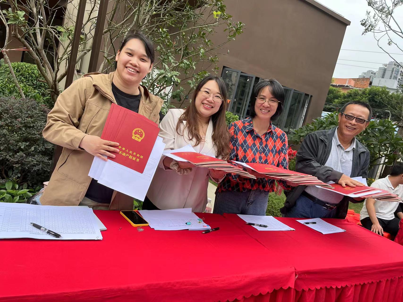 为有效维护业主权益,公司根据项目建设情况,主动与南宁市不动产登记中心沟通协调,在项目竣工同时,同步推进规划核实、实测备案、权籍调查、已售房屋不动产首登和转移登记业务,有效筛选符合交房即得证条件的业主,在交房前完成超过80户房屋不动产权证办理,让业主收房的同时拿到不动产权证。