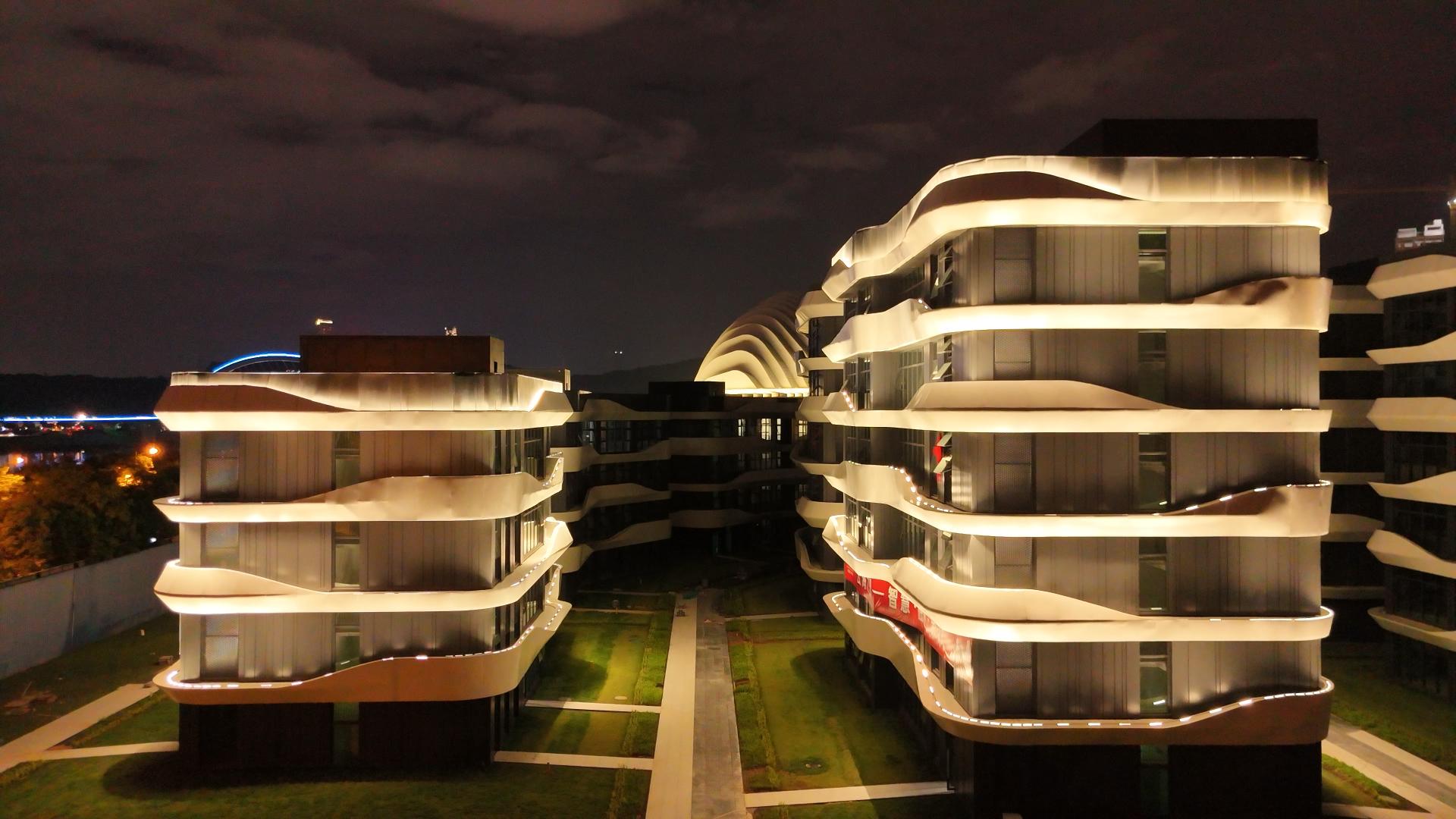 东盟乐鱼(中国)文创中心的夜景亮化工程,有亮度、有温度,为五象新区聚人气、促发展,也给城市夜景新添了一道靓丽的风景线。为达到效果,该亮化工程可谓藏匿了很多“小心思”。在建筑的外立面、高架平台、异形柱部分通过灯光的变化,形成左右或上下的流动效果,模拟流水潺潺,变化丰富,形成不同的场景效果。