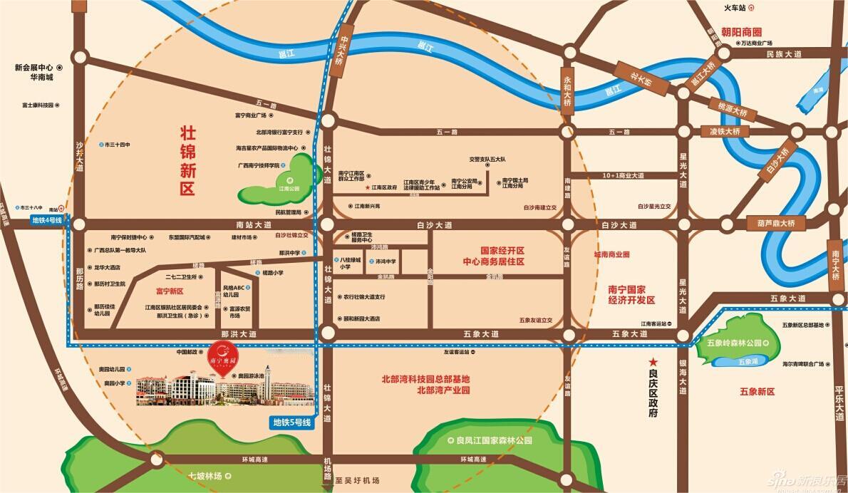项目位于五象新区龙岗片区步云路南侧,往东可与仙葫开发区隔江相望,毗邻邕江;往南可通五象大道往五象核心基地。繁华初现,开启商业新典范!