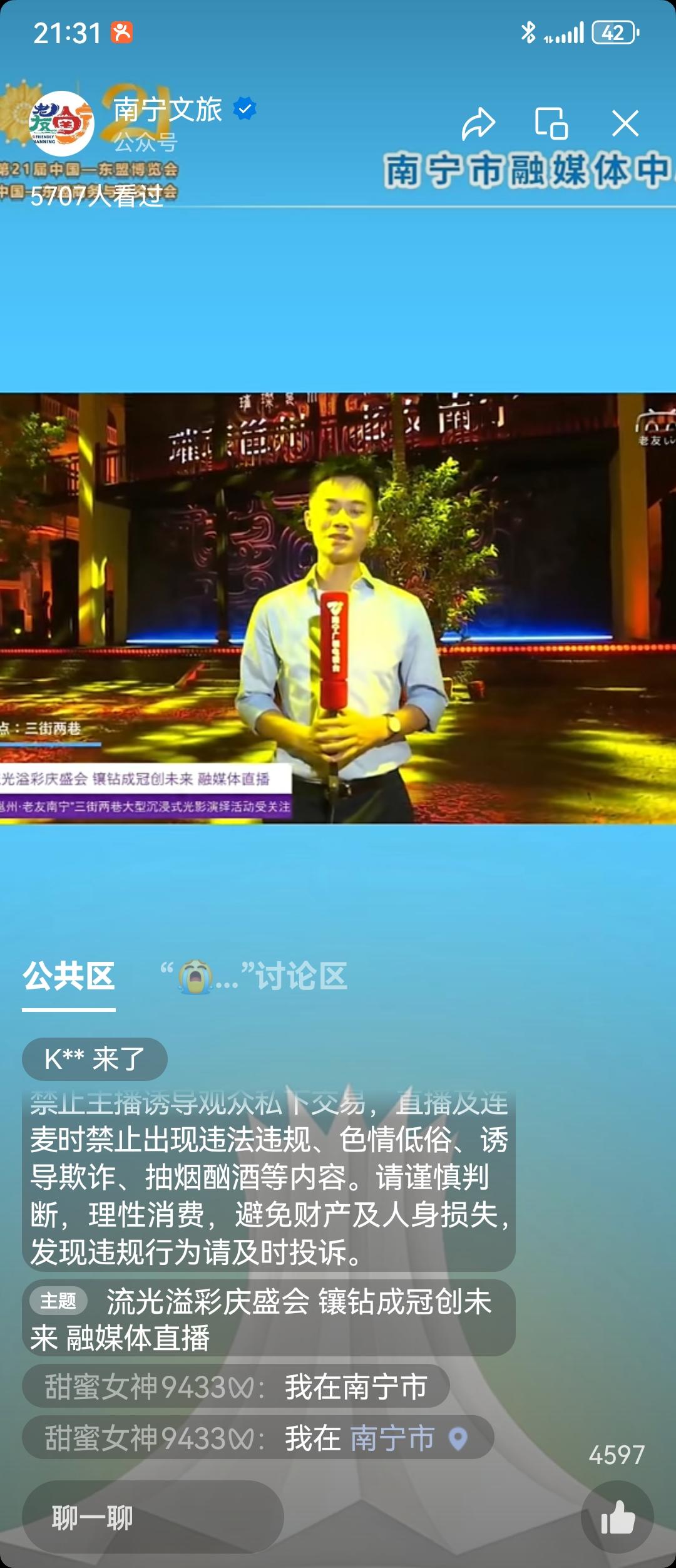南宁市融媒新媒体平台在活动期间,通过“南宁文旅”等多个官方新媒体账号,对光影演绎活动进行了4场精彩的直播联动。这些直播不仅让观众能够身临其境地感受光影的震撼与美丽,还通过互动环节增强了观众的参与感与体验感,进一步提升了活动的传播力与影响力,让“璀璨邕州·老友南宁”成为了东博会和峰会及国庆期间最耀眼的文化名片之一。在邕州古城·三街两巷的抖音账号,也分别在东博会和峰会期间和国庆节当天开通了两场直播,通过两场不同角度和主题的直播,既向广大东盟和外地游客介绍了三街两巷的参观游览路线,也着重展现了本次活动的精华演出,吸引了众多网友线上观看后,再来线下打卡。