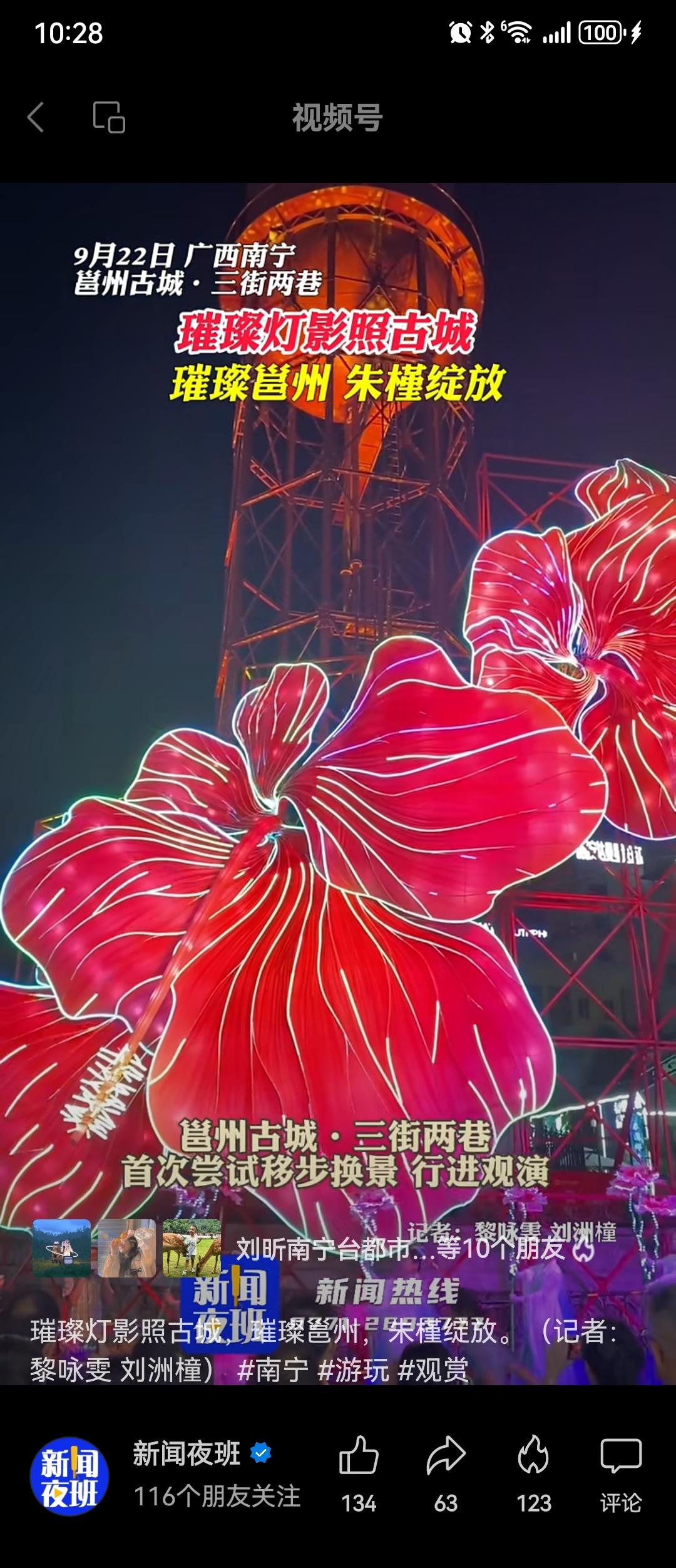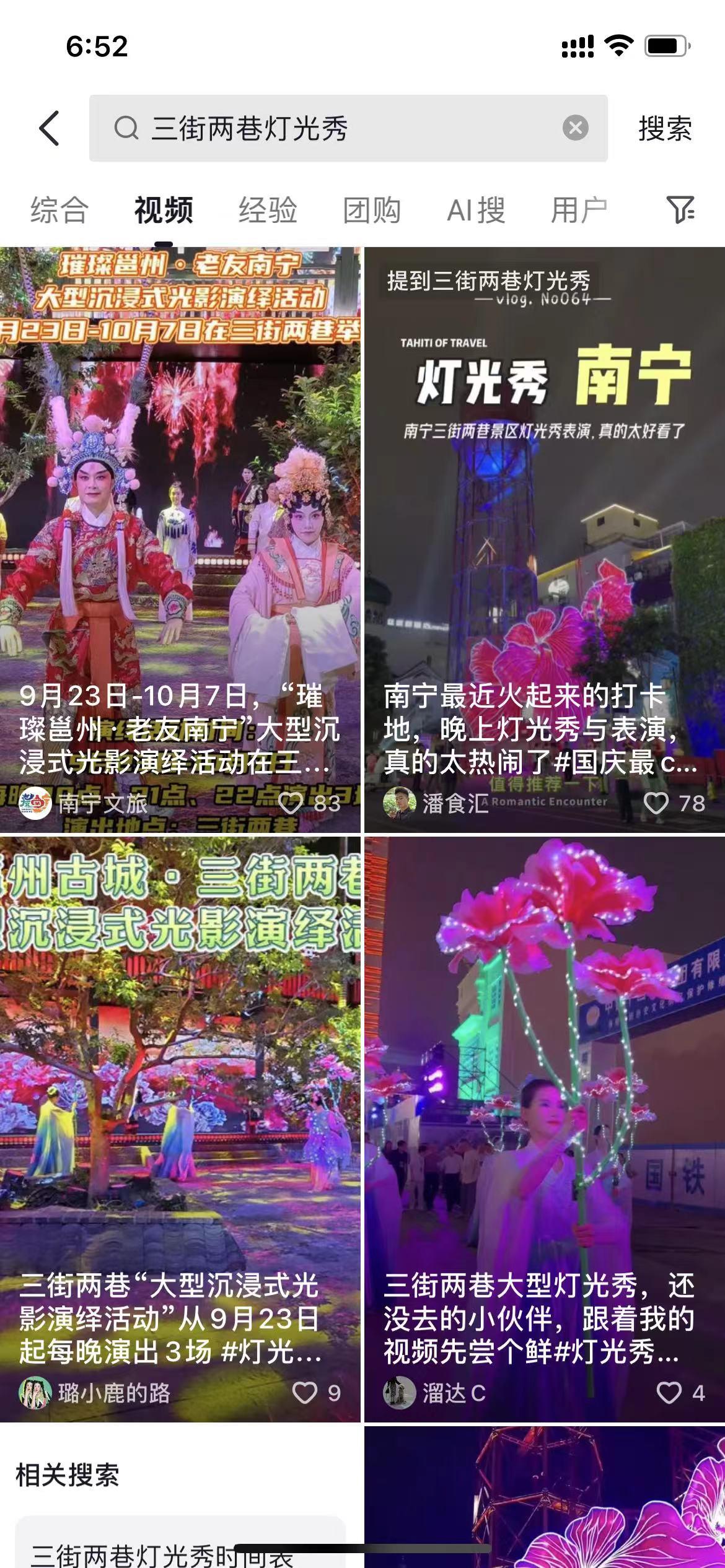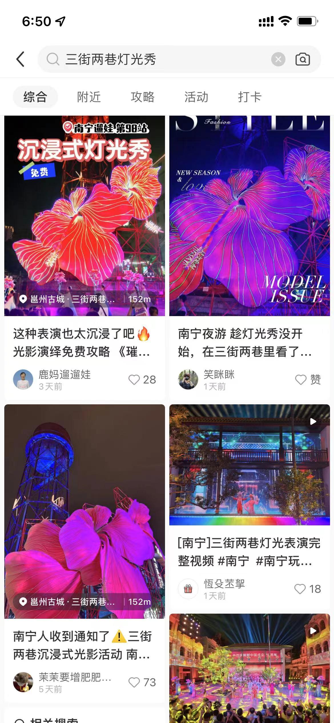 不仅如此,活动在同城媒体和来自全国游客观众上传的各类现场视频中,成为了南宁市民及游客热议的焦点,“三街两巷灯光秀”“国庆心动打卡地”“三街两巷美丽夜景太迷人”等热搜词条和新华街水塔下巨型朱槿花、朱槿花仙子翩翩起舞巡游的画面也持续刷屏,充分展现了活动在社交媒体上的高频讨论度。抖音达人“王同学”“超模CP”、自媒体账号“识南宁”等纷纷上传游玩打卡视频,众多素人博主也纷纷在抖音、小红书等平台上传拍照打卡、领票攻略,通过一系列引人入胜的短视频、图文等形式分享自己的光影体验之旅,进一步扩大了活动的影响力。截止活动结束,社交平台上的相关话题讨论量超过百万次,视频观看量更是突破亿级,让“璀璨邕州·老友南宁”成为了国庆期间网络上的热门话题。