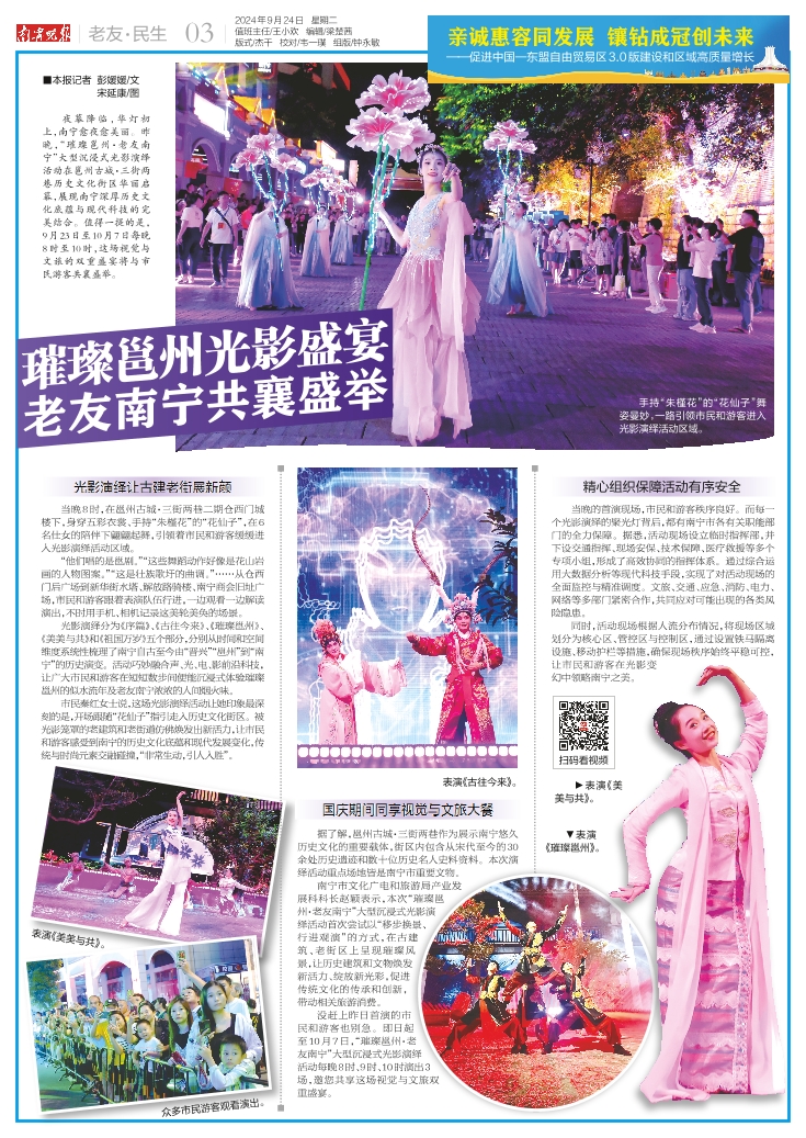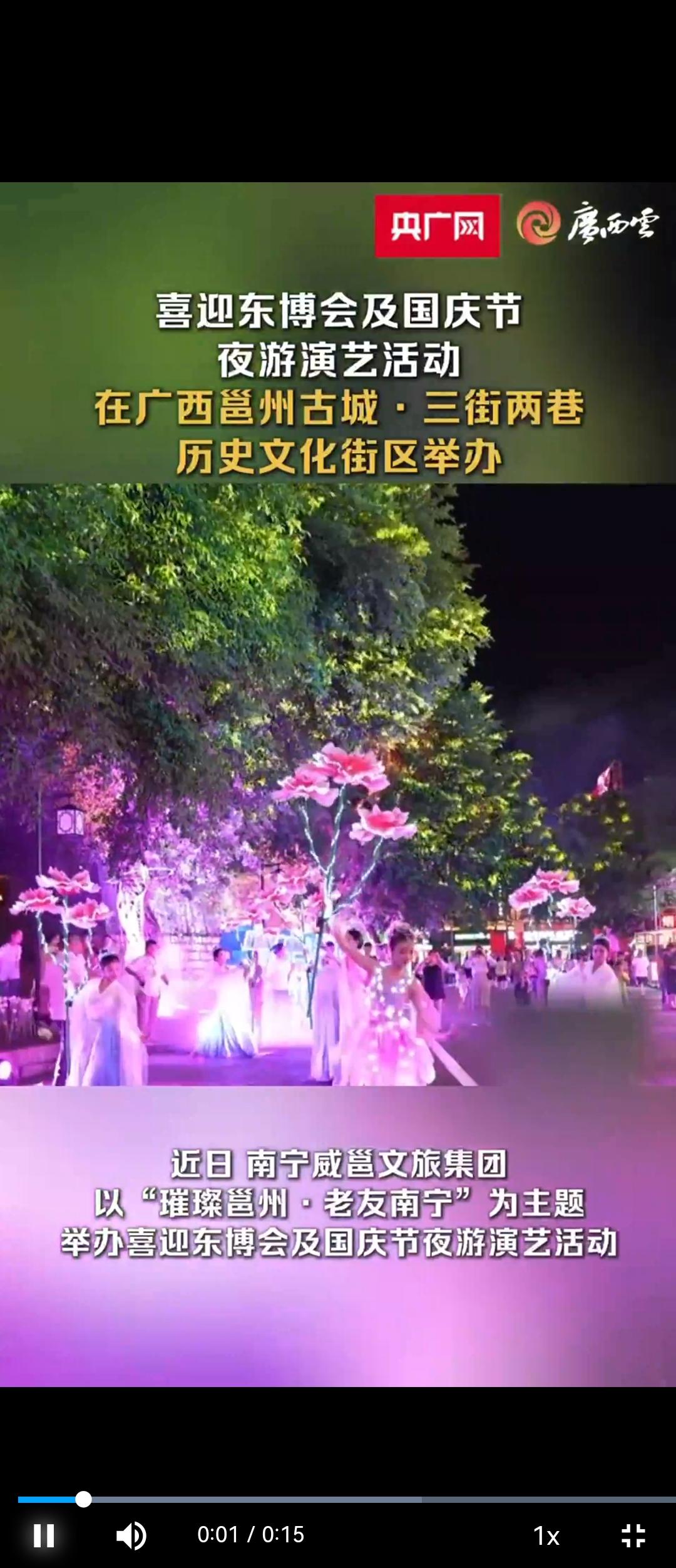 长达15天的“璀璨邕州·老友南宁”大型沉浸式光影演绎活动在国庆长假最后一晚落下帷幕,作为邕州古城·三街两巷历史文化街区首次尝试以“移步换景、行进观演”的方式从仓西门后广场到南宁商会旧址广场进行“沉浸式沿途分节点行进”的崭新演出,从第21届中国—东盟博览会、中国—东盟商务与投资峰会(以下简称东博会和峰会)举办到国庆期间,吸引了众多媒体的广泛关注与深度报道,活动话题度、影响力持续走高。9月23日至10月7日间,全网共计获得新闻曝光报道42条,融媒体直播4场,网络阅读量(含直播观看量)更是高达3500万次,电视媒体触及人群超过1200万人。