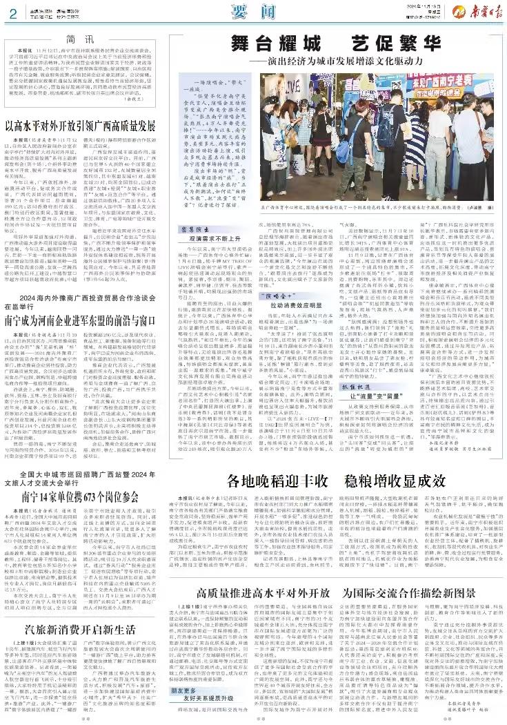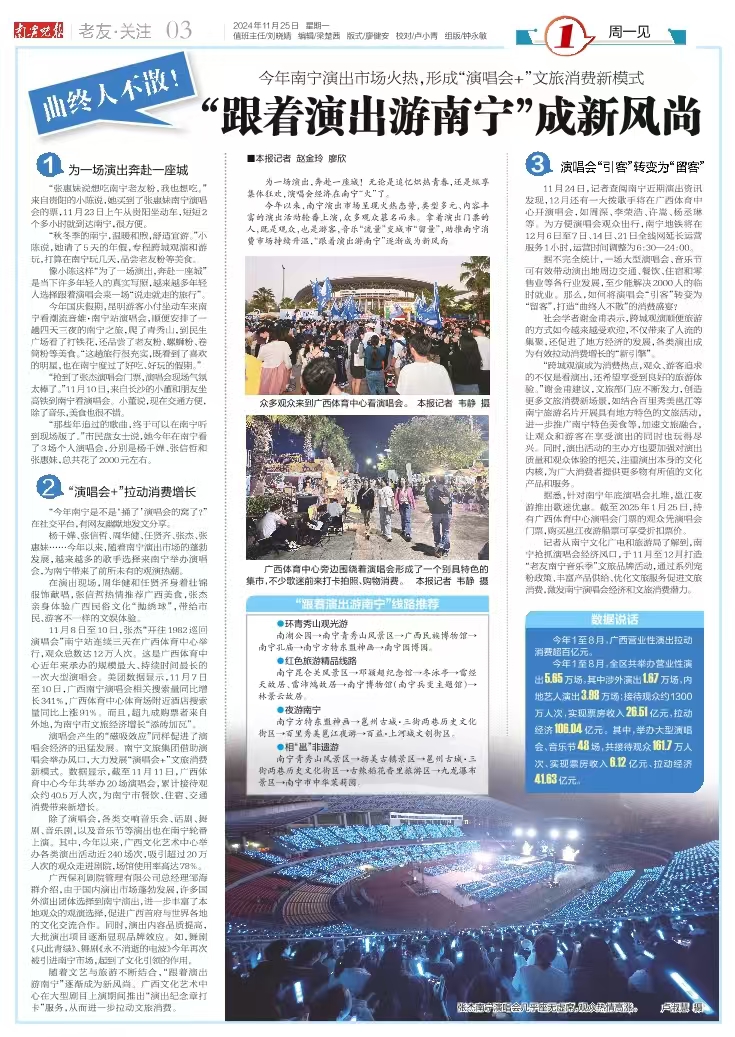 南宁文旅集团副总经理林国城在接受媒体采访时表示,南宁文旅集团将发挥南宁市国有文旅平台公司的作用,推动大型、重量级的文艺演出加速加密落地,对有意向在南宁市举办个人演唱会的艺人加快合作步伐,力争早日引进。同时,将依托广西体育中心举办的大型演出和赛事,持续关注和打造文旅消费新热点,创造多重体验感的文旅消费新场景。