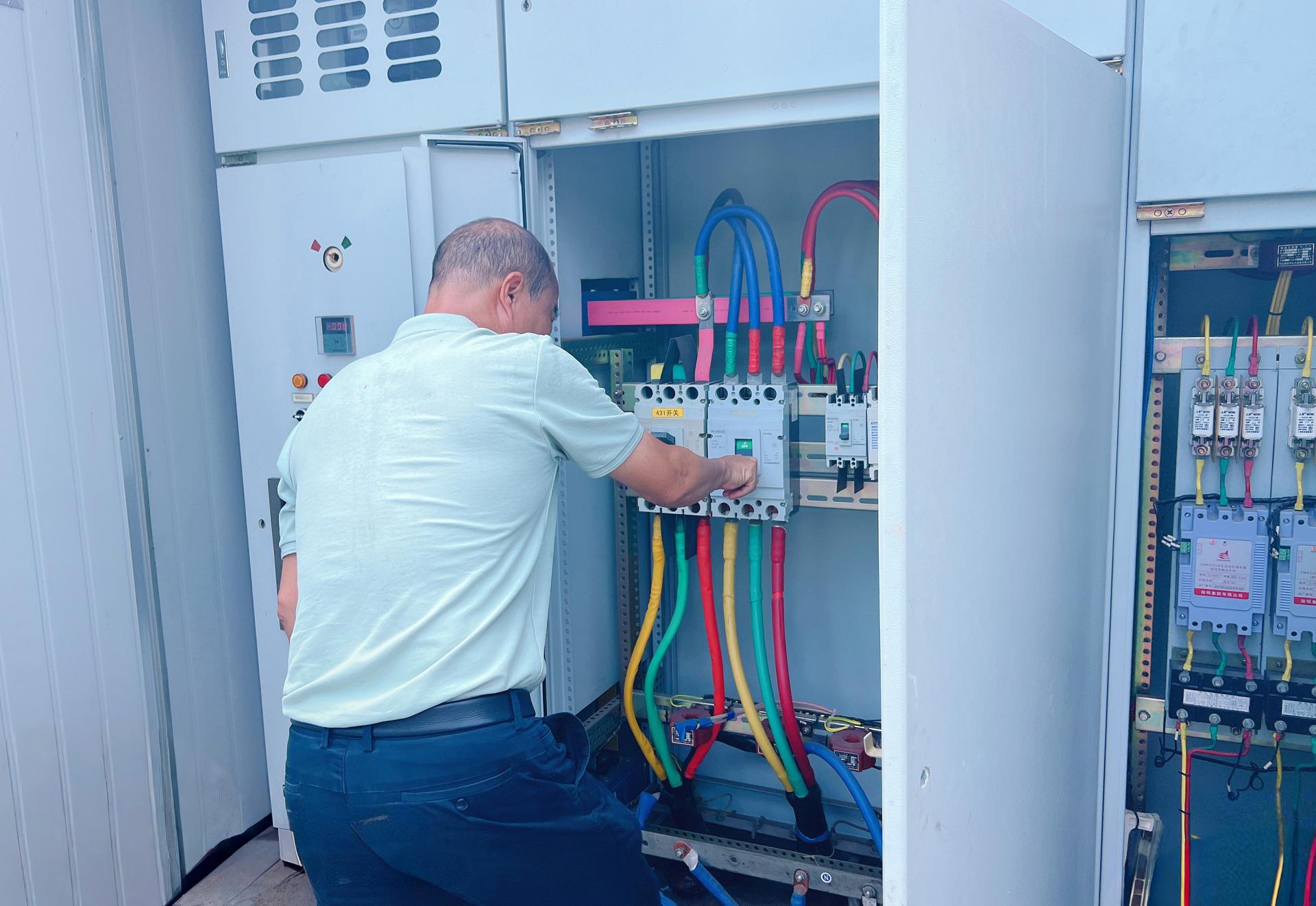 值班人员检查南宁港受损铺面漏水情况并采取断电保护措施