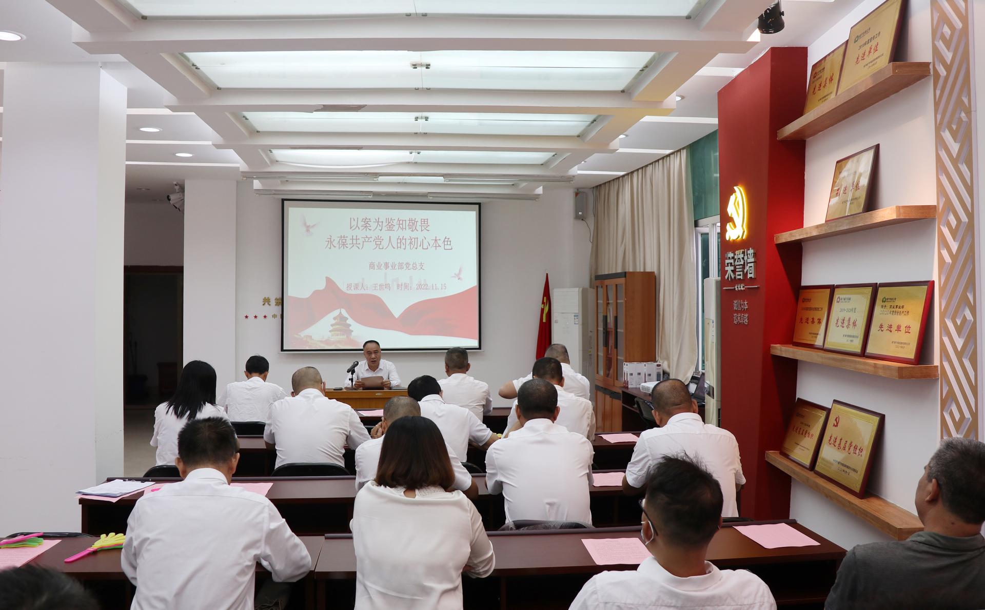 活动中,商业事业部党总支书记王世鸣为全体党员和入党积极分子上了题为《以案为鉴知敬畏永葆共产党人的初心本色》的廉政党课,强化底线意识。