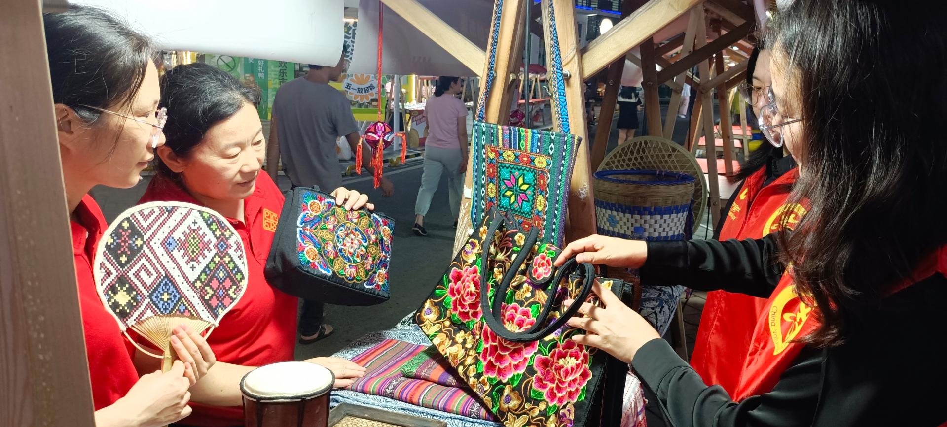 文创市集以展现广西特色民族文化为核心,展品涵盖非遗工艺、创意好物、国风艺术等品类。壮锦、绣球、铜鼓、花竹帽……各样的民族特色物品陈列在展台上,吸引群众纷纷驻足了解,“威匠在线”志愿服务队成员们细心为大家做民族特色物品讲解,为群众发放民族团结进步宣传手册,宣传民族团结进步知识。