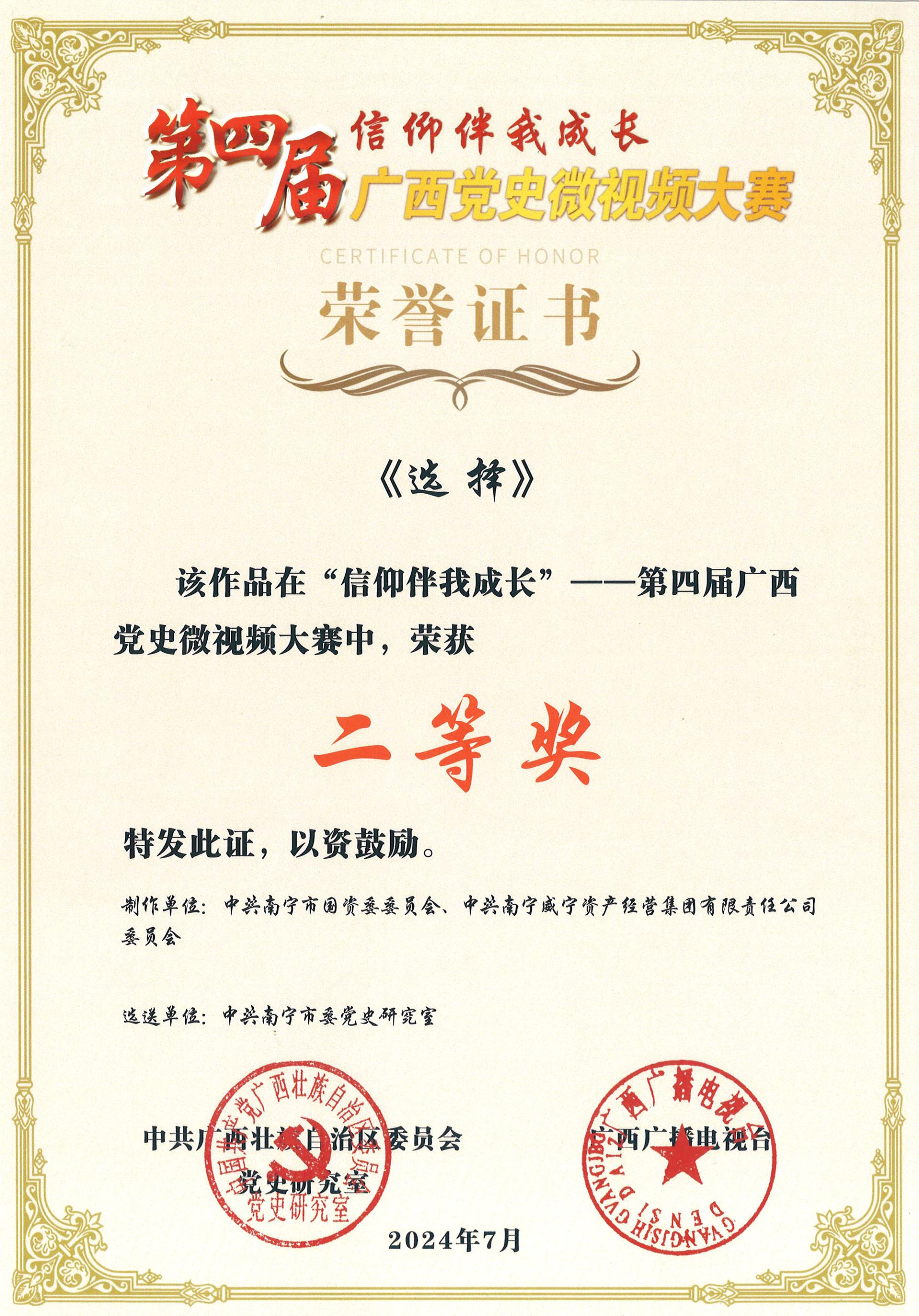 2024年7月10日,“信仰伴我成长”第四届广西党史微视频大赛颁奖仪式在广西广播电视台隆重举行。经过激烈角逐,乐鱼(中国)资产经营集团参赛作品《选择》在大赛中脱颖而出,荣获二等奖。