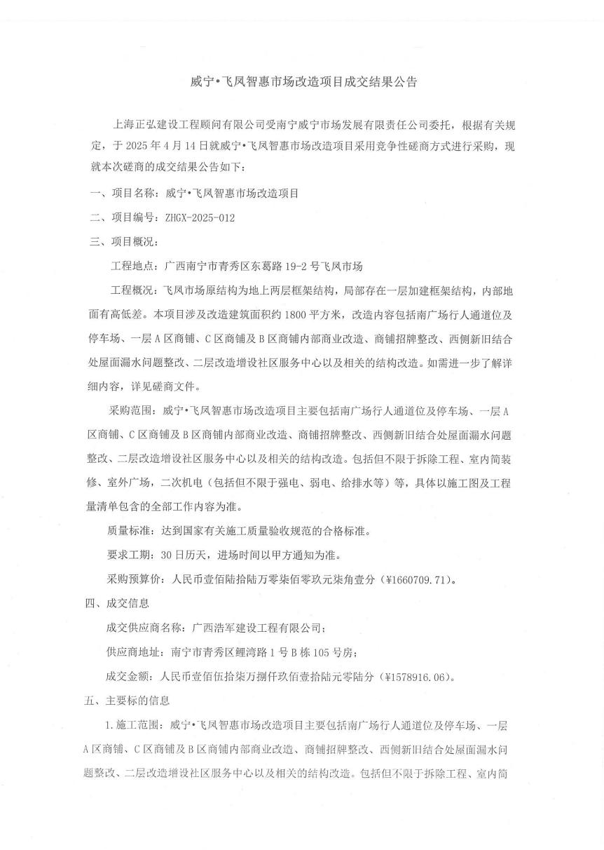 乐鱼(中国)·飞凤智惠市场改造项目成交结果公告