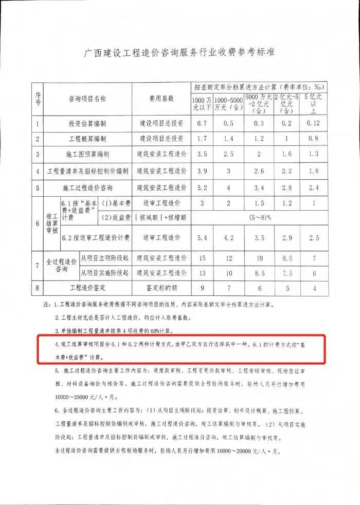 根据《广西建设工程造价咨询服务行业收费参考标准》桂价协字[2019]15号中竣工结算审核项目6.1进行计费 |