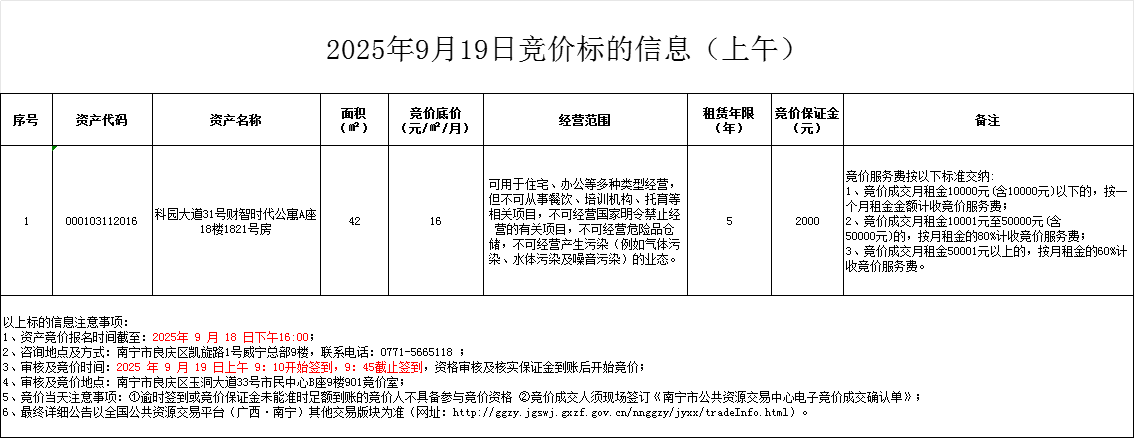 2025年9月19日竞价标的信息(现场竞价)