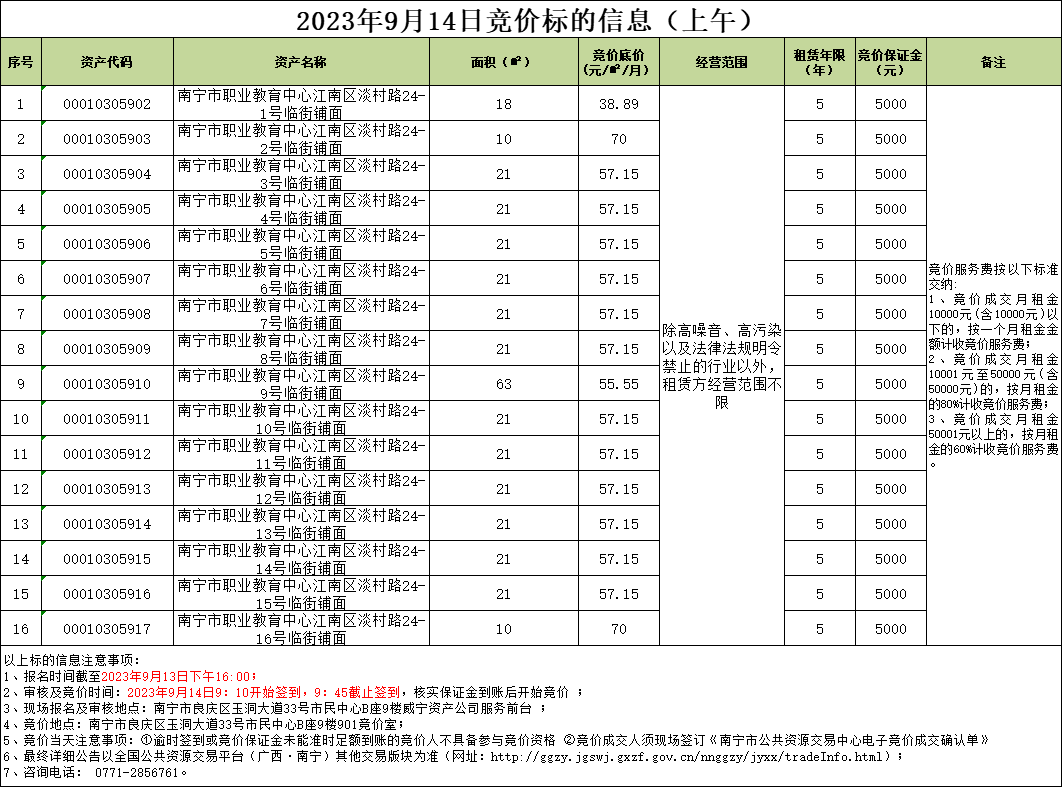 2023年9月14日竞价标的信息