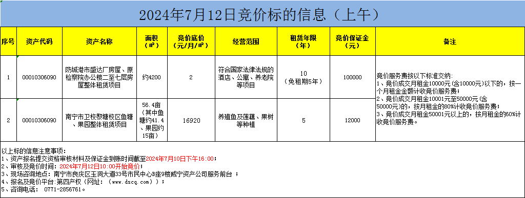 2024年7月12日竞价标的信息(线上竞价)