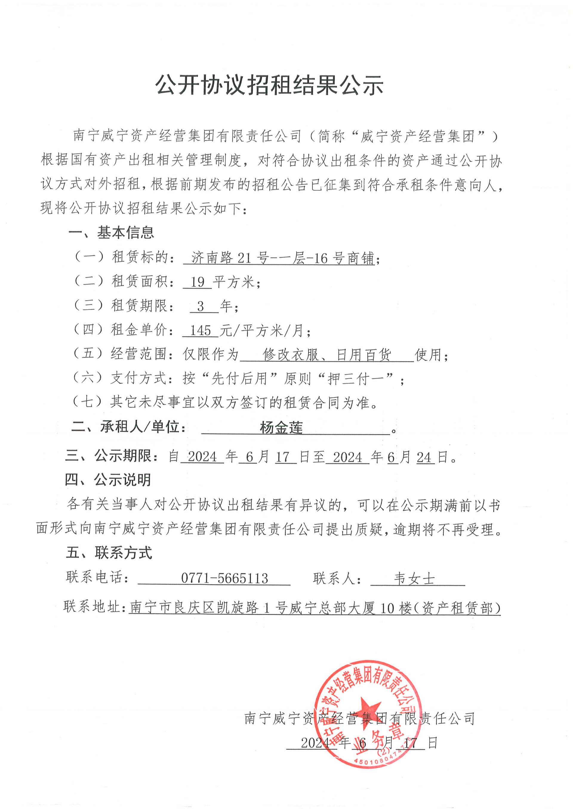 济南路21号-一层-16号商铺公开协议招租结果公示