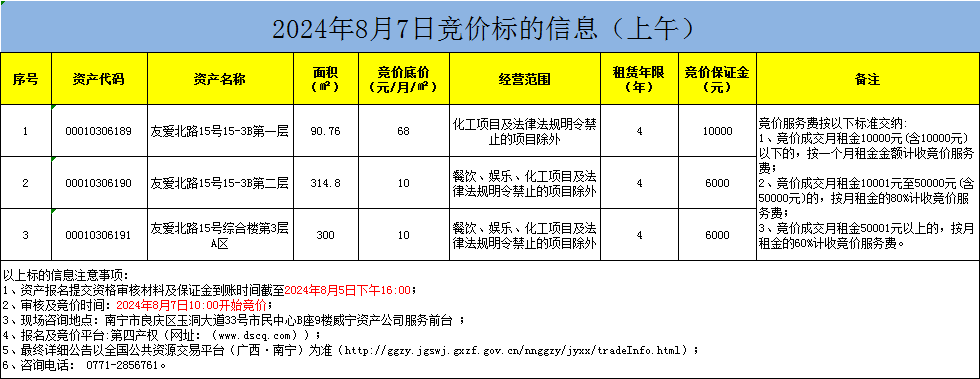 2024年8月7日竞价标的信息(线上竞价)
