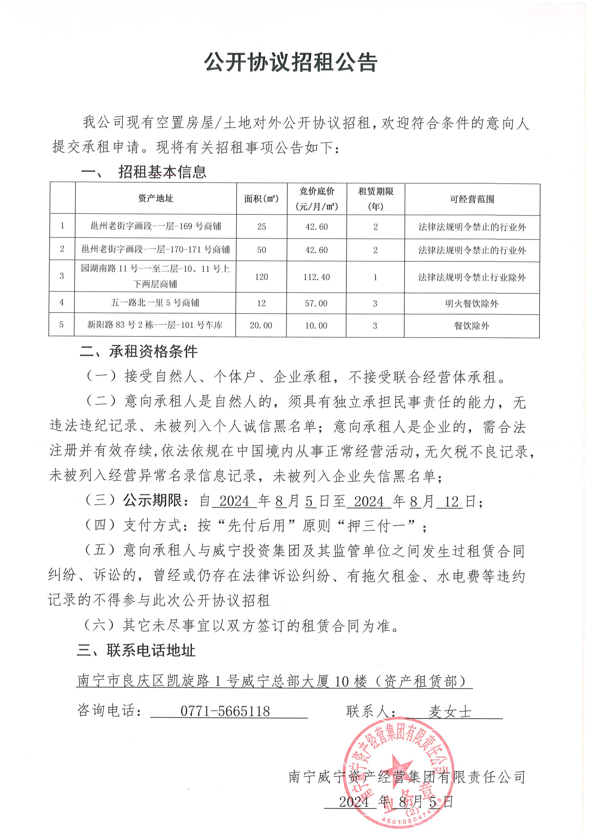 邕州老街、园湖南路、五一路、新阳路等资产公开协议招租公告