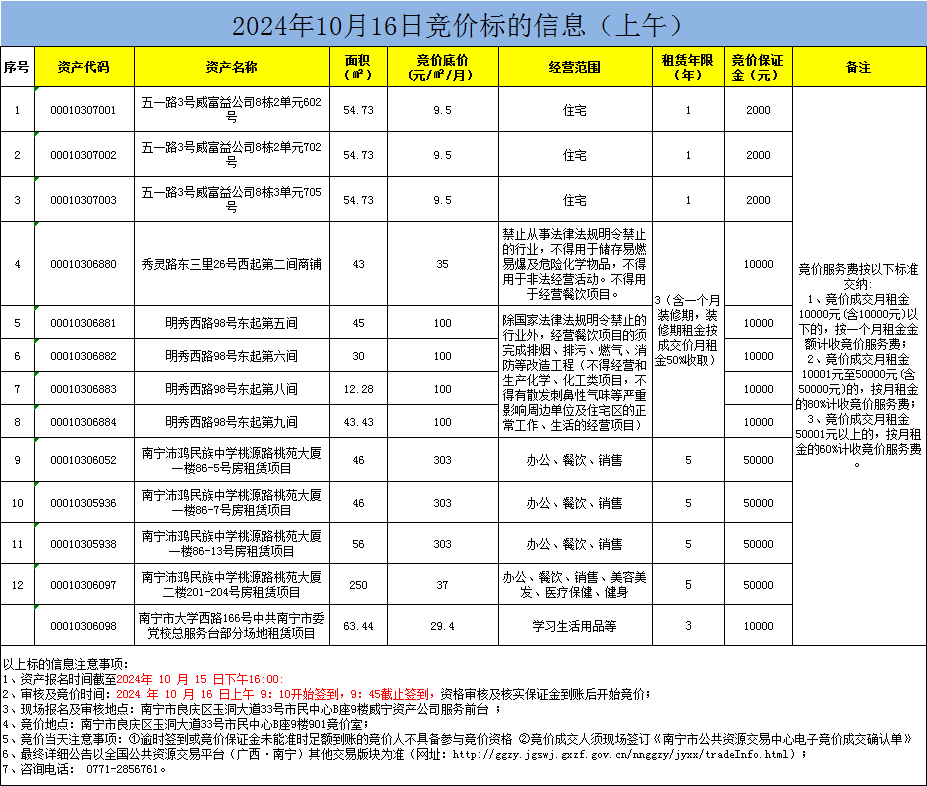 2024年10月16日竞价标的信息(现场竞价)