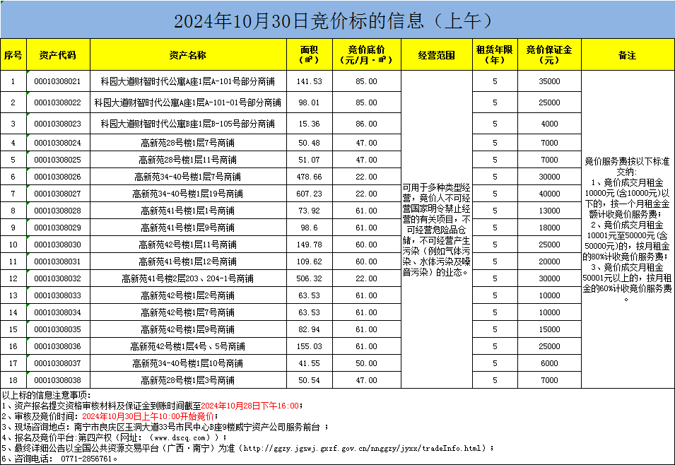2024年10月30日竞价标的信息(线上竞价)