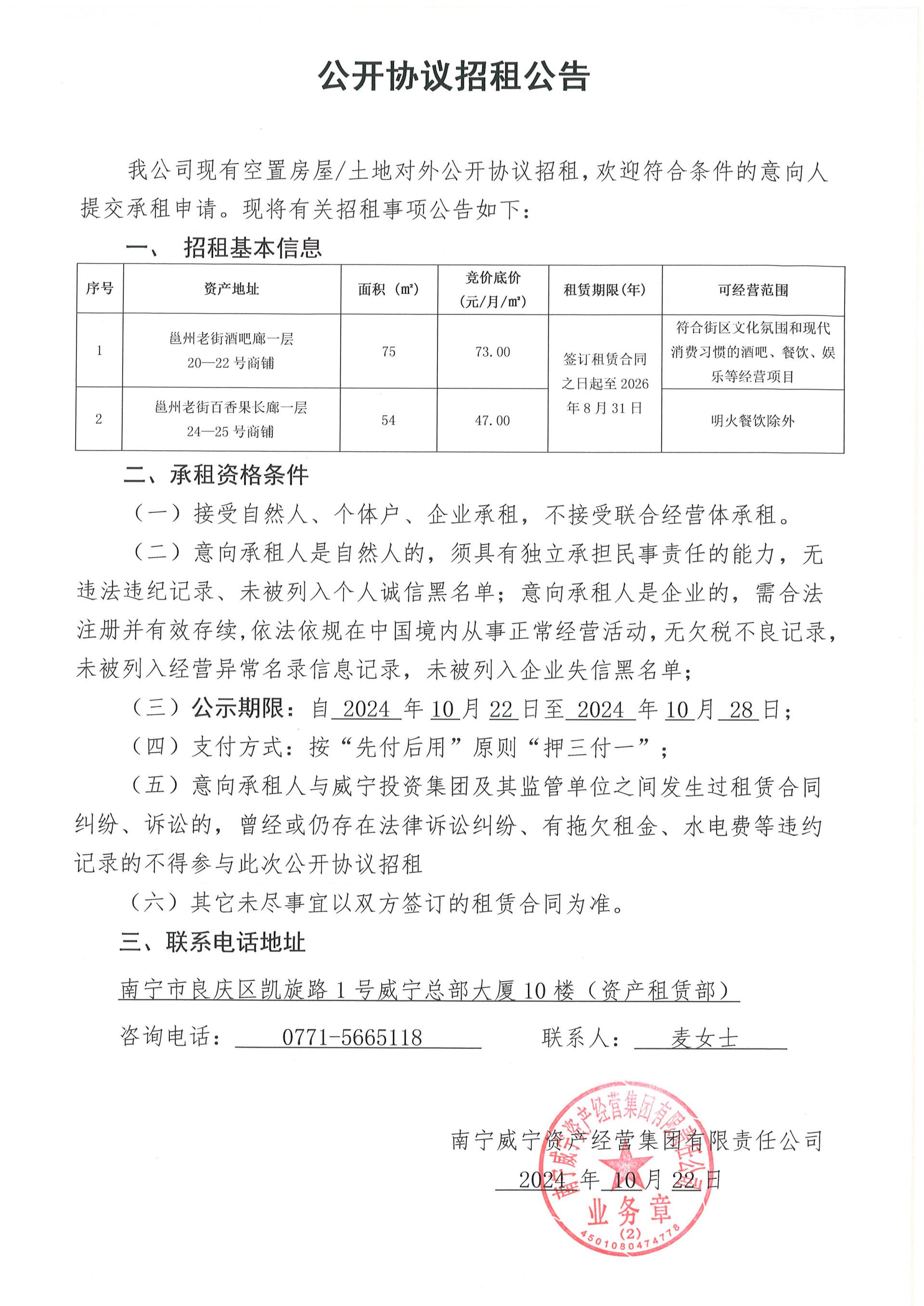 邕州老街酒吧廊20-22号铺及百香果长廊24、25号铺公开协议招租公告