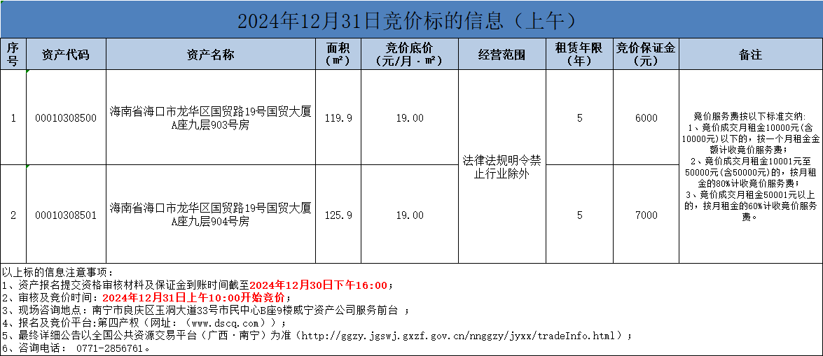 2024年12月31日竞价标的信息(线上竞价)