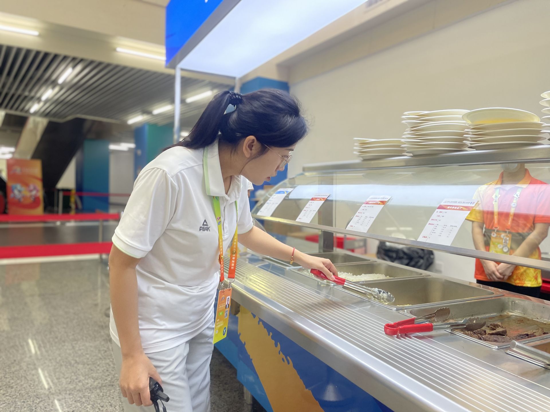 韦婉玲在运动员餐厅检查,及时沟通汇报情况。记者 邓玲 摄