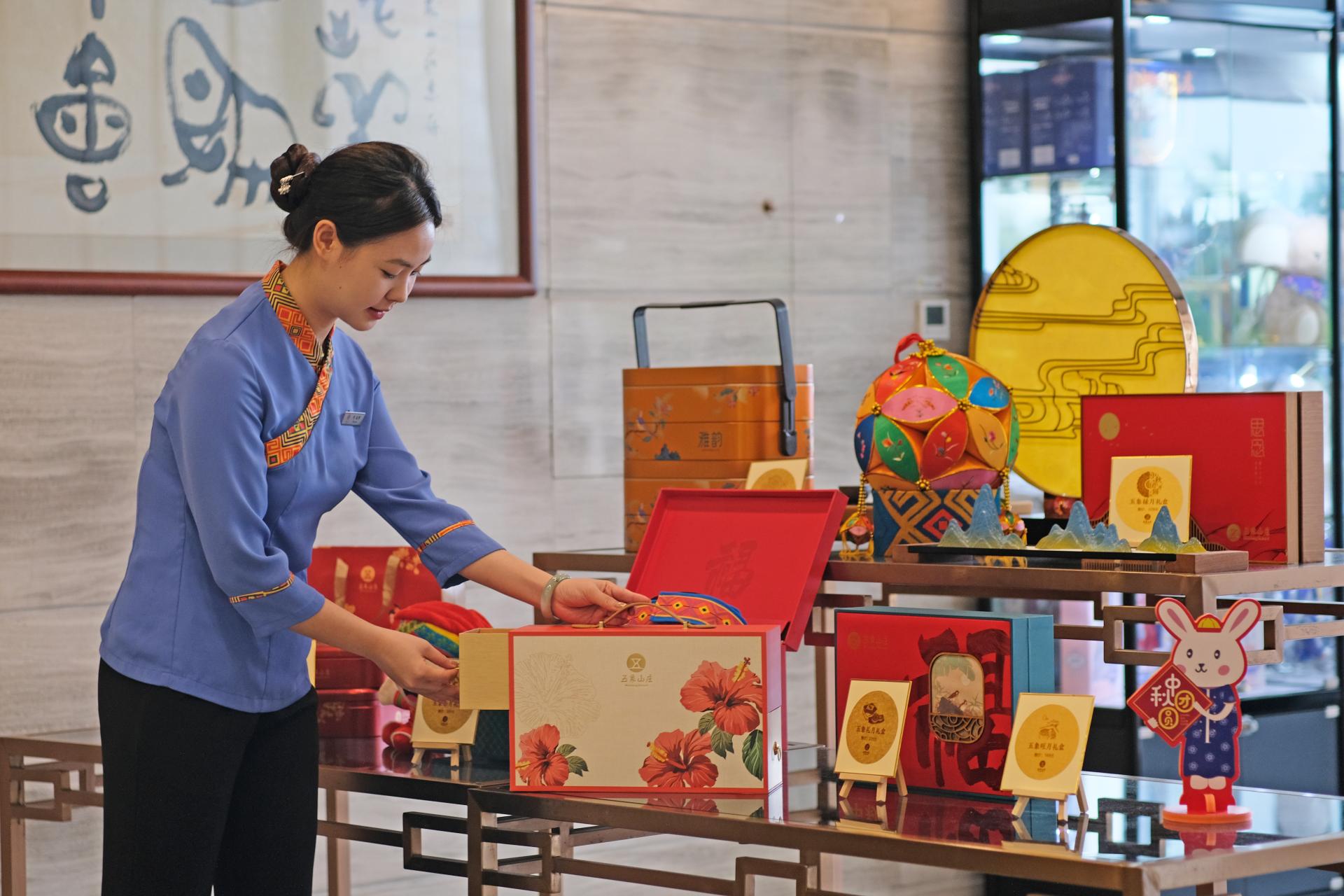 在佳节前夕,五象山庄工作人员正精心布置“五象月”产品展示区,吸引消费者前来购买。五象月精选上等原料,采用古法配方,力求精益求精。蛋黄纯白莲蓉月饼中莲蓉馅料幼滑细腻,软糯可口;火腿五仁月饼选用优质金华火腿,搭配严挑苛选的上好果仁,配料考究,皮薄馅多,一口咬下,余味齿颊留香;确保每一口都是经典的味道,每一口都是对传统的致敬。