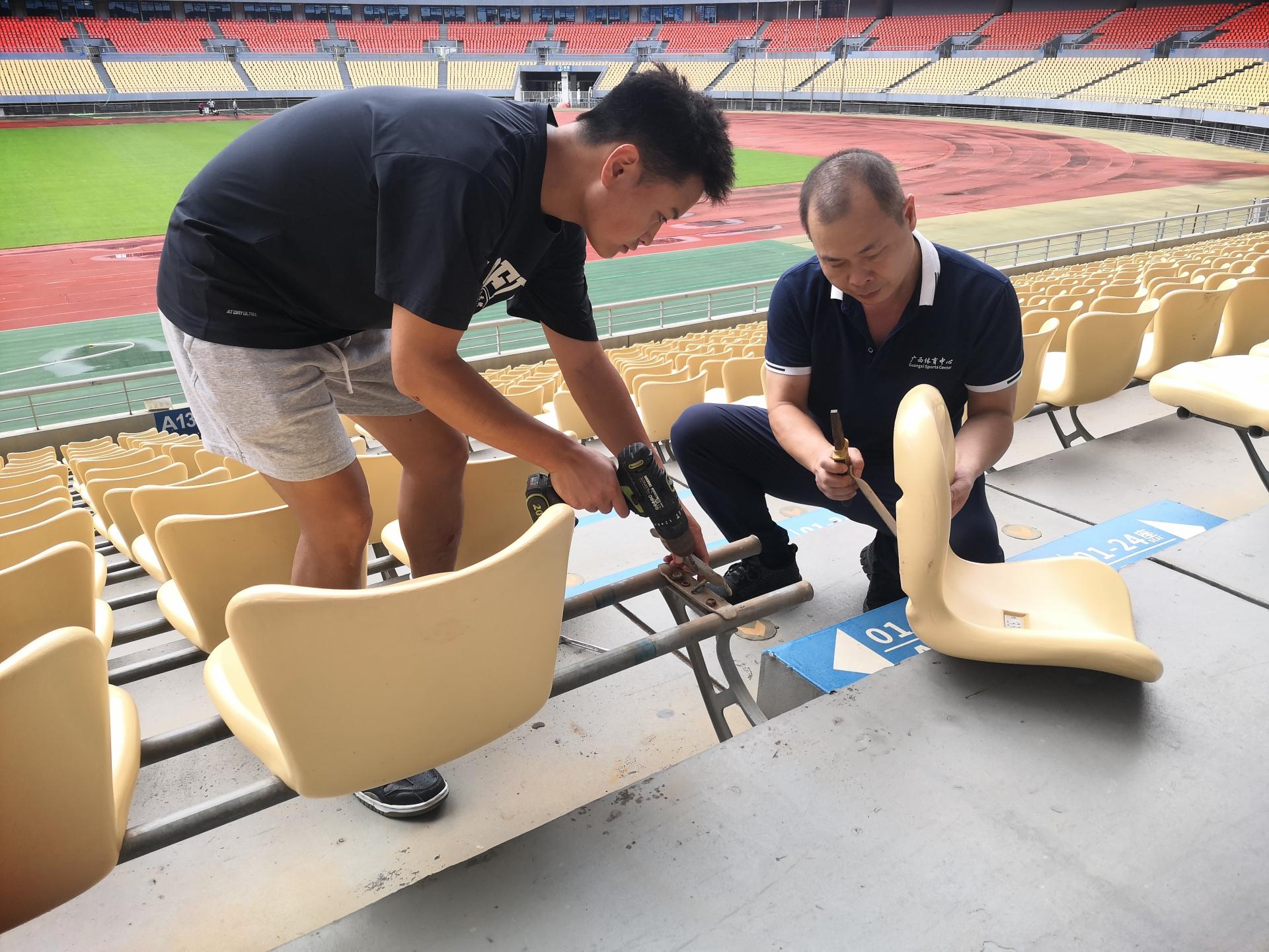 近期,广西体育中心迎来众多赛演活动,为保障赛演活动质量,为市民群众提供良好的观演体验,工作人员正抓紧时间对主体育场观演座位进行维修加固,以及在园区检查供电设备情况,将安全措施落实到位。