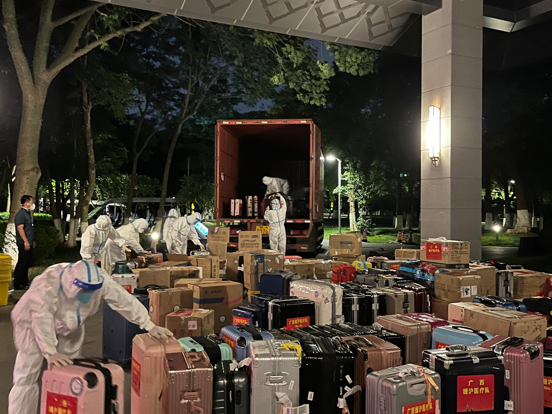2022年5月底,广西援沪医疗队180人返桂休整入住五象山庄,在五象山庄统一部署下,前厅部抽调礼宾部和宾客关系部所有成员,立即成立接待小组,制定接待方案,着防护服,佩戴N95口罩进入现场进行指引及搬运行李服务。共计完成行李运送及搬运255件,行李累计重量达3.8吨,在3个小时内将所有行李准确无误的逐一配送到所有房间,为医疗队成员争取了更多的休息时间。部门集中智慧,用精心制订周详的接待方案,以无微不至的温情服务,为医护人员搭起了最有温度的家,让身处异乡的医护人员感受到了亲人般的温暖。五象山庄前厅部以高效的效率和忘我的服务精神,得到了广西抗疫指挥部的充分肯定。