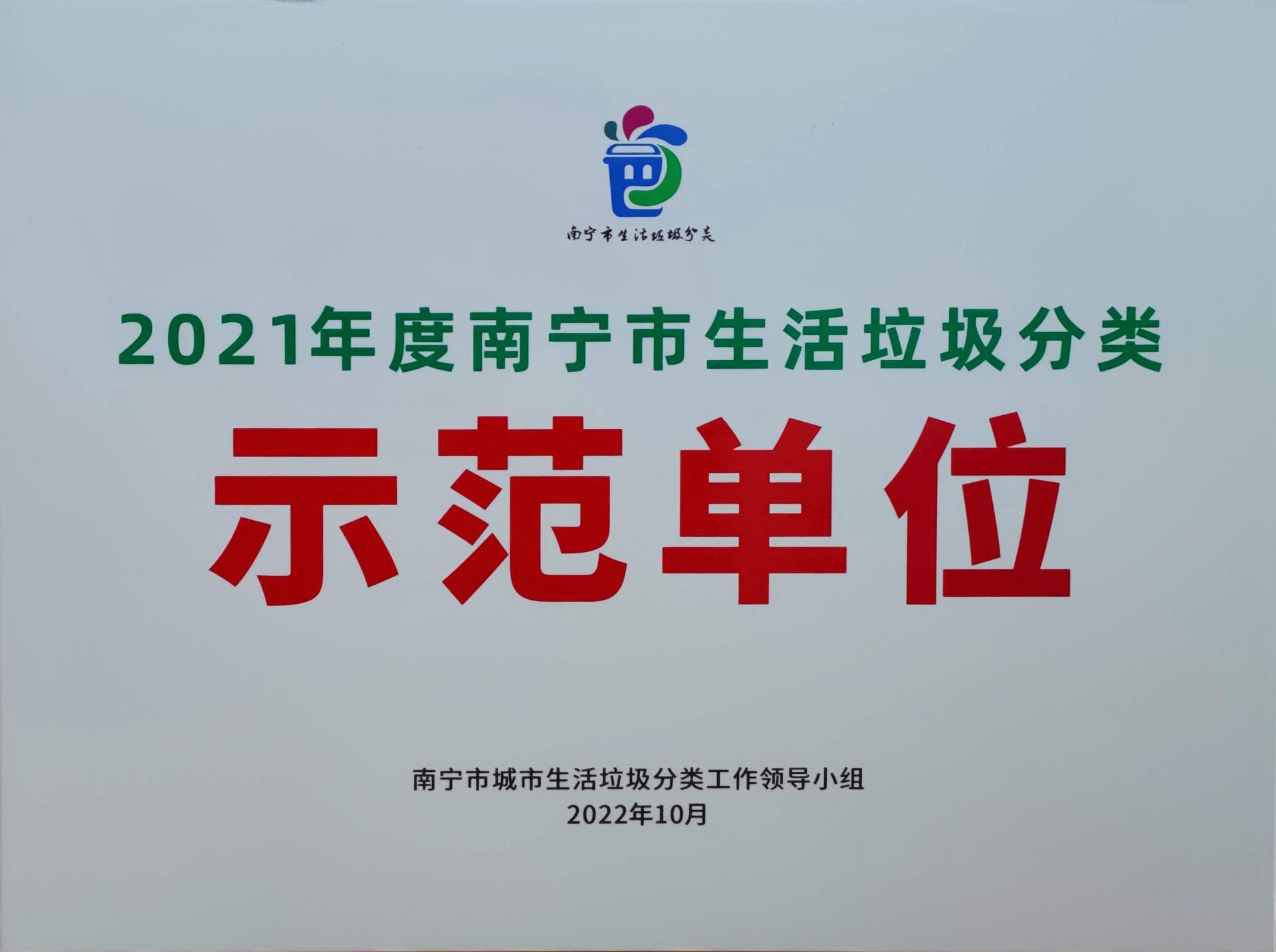 银河大酒店获评为“2021年度南宁市生活垃圾分类示范单位”