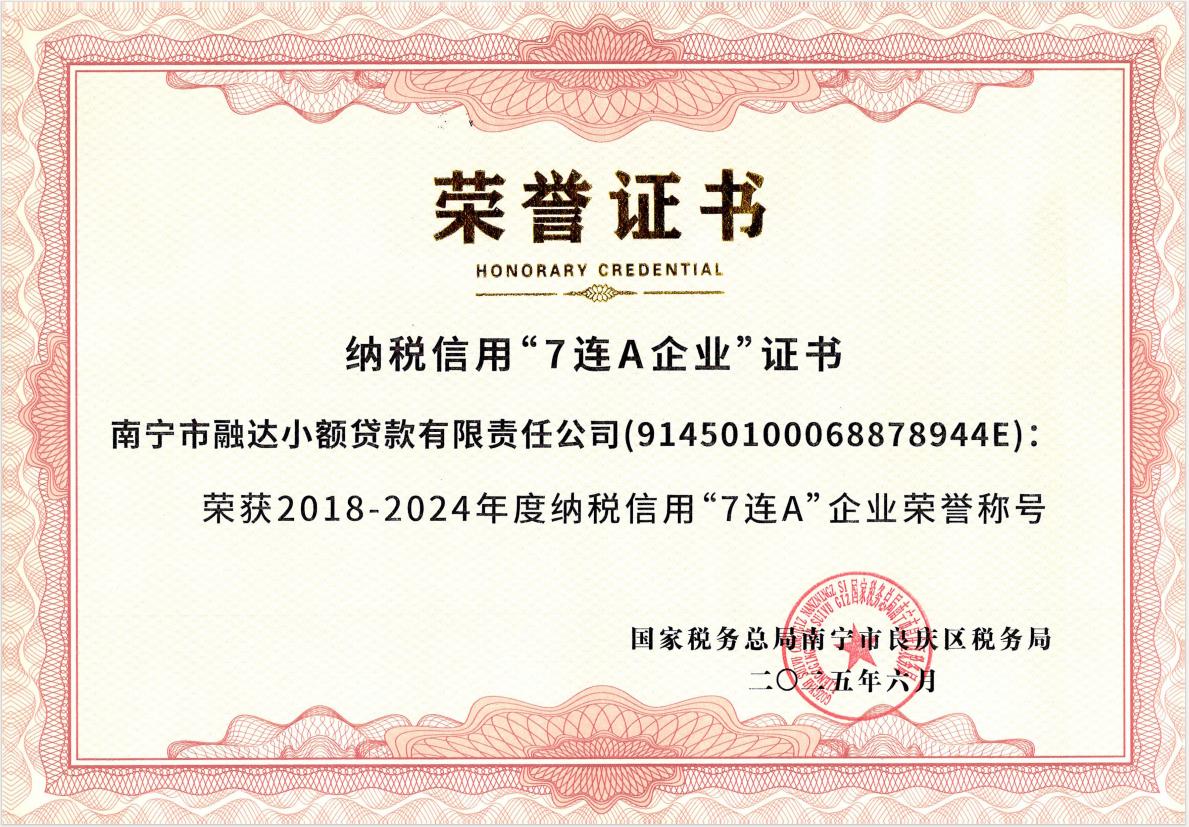 纳税信用“7连A企业”证书近日,南宁供应链集团下属企业融达小额贷款有限责任公司(以下简称“融达小贷公司”)凭借在税务管理方面的卓越表现,荣获国家税务总局南宁市良庆区税务局颁发的2018-2024年度纳税信用“7连A”企业荣誉称号,这已是融达小贷公司连续7年被税务机关评定为“A级纳税人”。自成立以来,融达小贷公司始终将依法纳税视为企业稳健发展的重要基石,严格遵循国家税收法律法规,持续完善内部财务管理制度,确保...