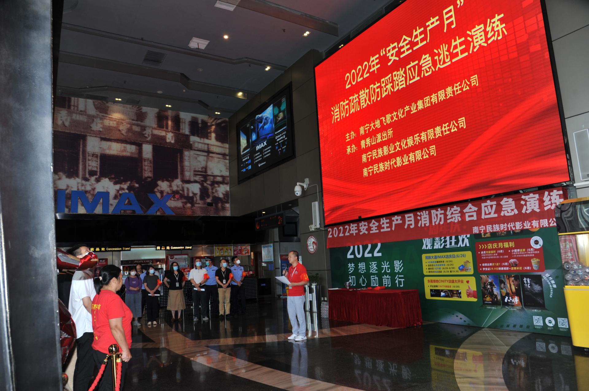 由南宁大地飞歌文化集团有限责任公司主办(下称南宁大地飞歌集团公司)、青秀山派出所、南宁民族影业文化娱乐有限责任公司(下称民影公司)、南宁民族时代影业有限公司(下称时代公司)联合承办的2022年“安全生产月”消防疏散防踩踏应急逃生演练,于2022年6月22日上午在民族影城举行。南宁大地飞歌集团公司各部门负责人及员工、青秀山派出所部分民警、民影公司、时代公司全体人员、一分公司、影城各租赁企业(商户)部...