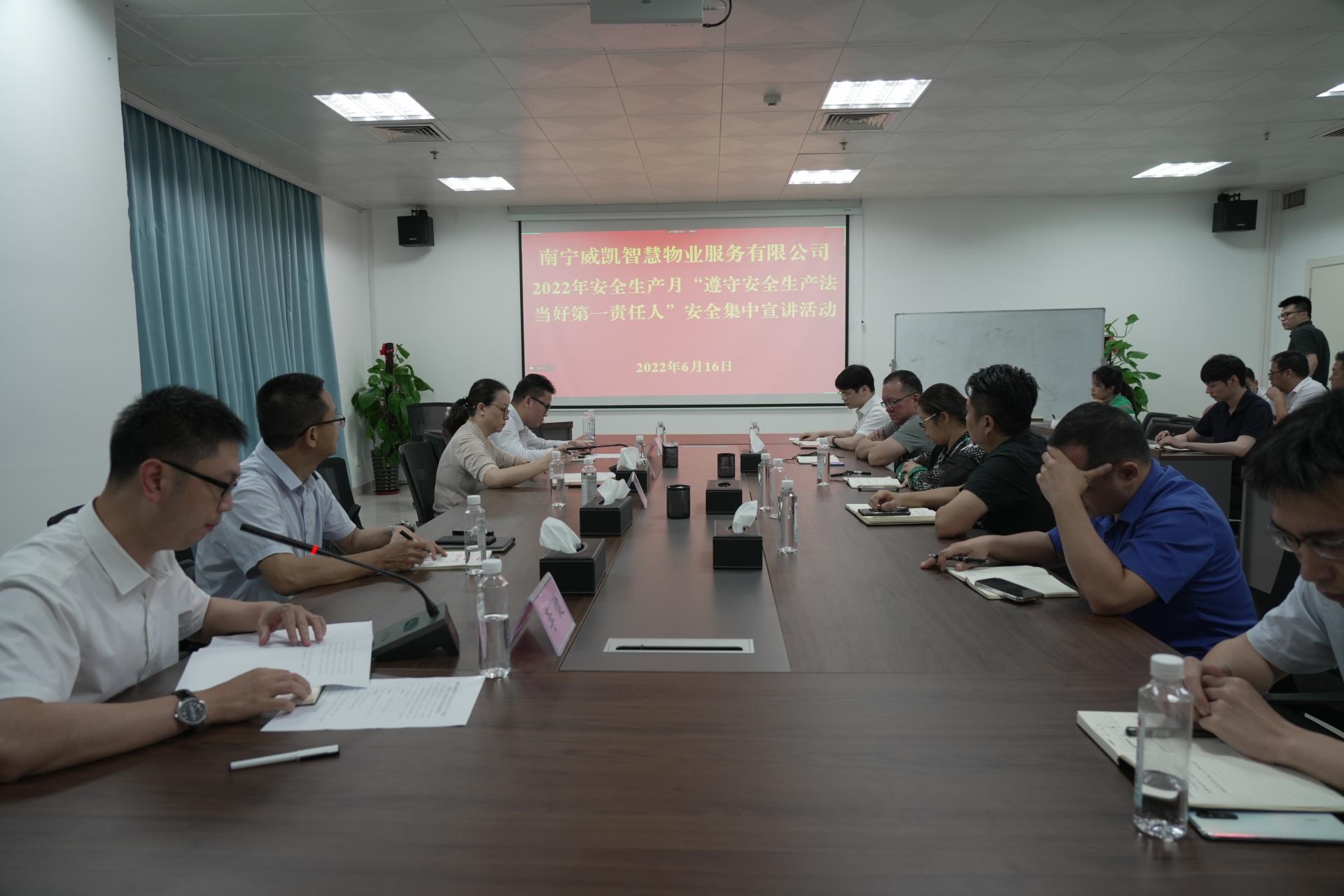 场2022年6月,是第21个全国“安全生产月”。威凯智慧物业深入贯彻学习习近平总书记、李克强总理的重要指示精神,严格落实国务院安委会、国资委的部署要求,就安全生产工作进行进一步细化,下发到各部门各监管公司各托管物业逐一落实,向党和人民交出一份满意的答卷。安全教育不松懈防患于未“燃”6月16日下午,威凯智慧物业邀请南宁市安全管理协会会长夏...