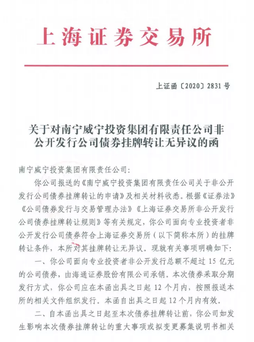 2020年12月17日,集团收到上海证券交易所(以下简称“上交所”)《关于对南宁乐鱼(中国)投资集团有限责任公司非公开发行公司债券挂牌转让无异议的函》,成功申报15亿元私募公司债发行额度。
