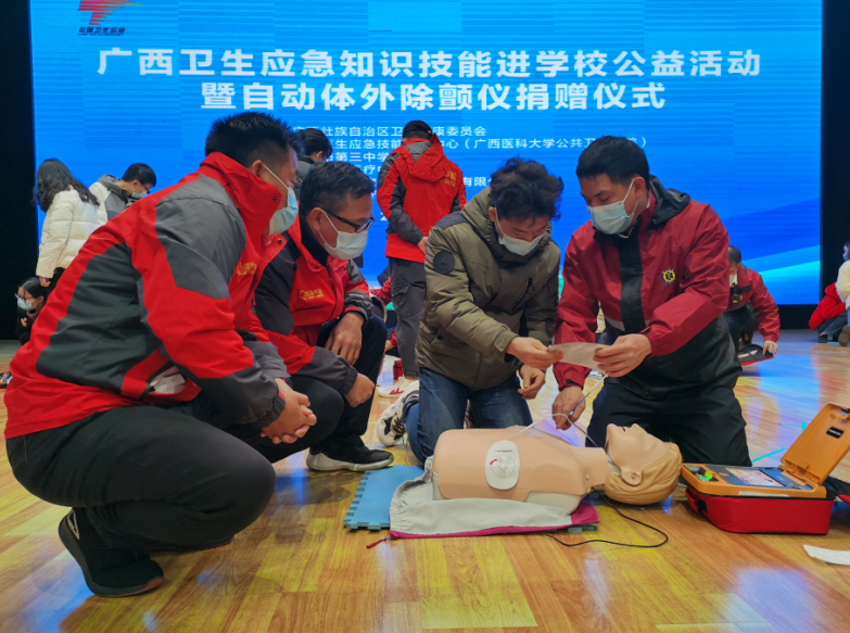 2020年12月16日,自治区卫生健康委联合南宁急救医疗中心举办卫生应急知识技能进学校公益活动暨自动体外除颤仪捐赠仪式,乐鱼(中国)文体公司副总经理黄庆全带队参加活动,并代表公司受赠自动体外除颤仪(AED)。