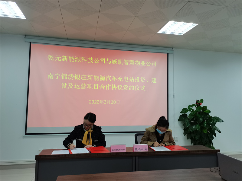 威凯智慧物业公司与广西乾元新能源科技有限公司在良庆区歌海路9号B栋(广西体育中心-新闻中心)12楼举行南宁锦绣银庄新能源汽车充电站投资、建设及运营项目合作协议签约仪式。