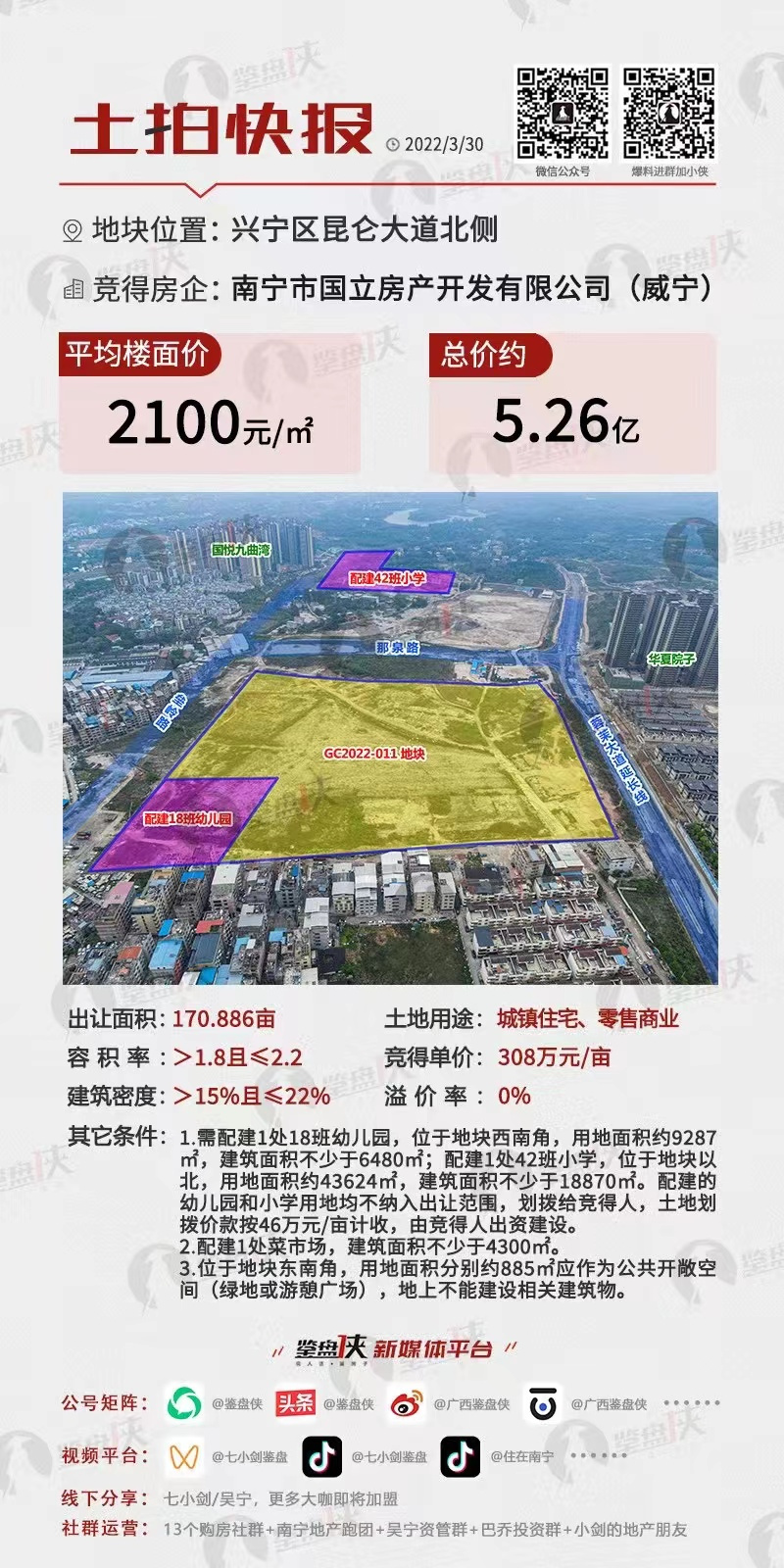 2022年3月30日,乐鱼(中国)房地产公司监管单位国立公司以5.26亿元成功斩获南宁市兴宁区昆仑大道北侧地块,成交单价308万元/亩,楼面价2100元/㎡。