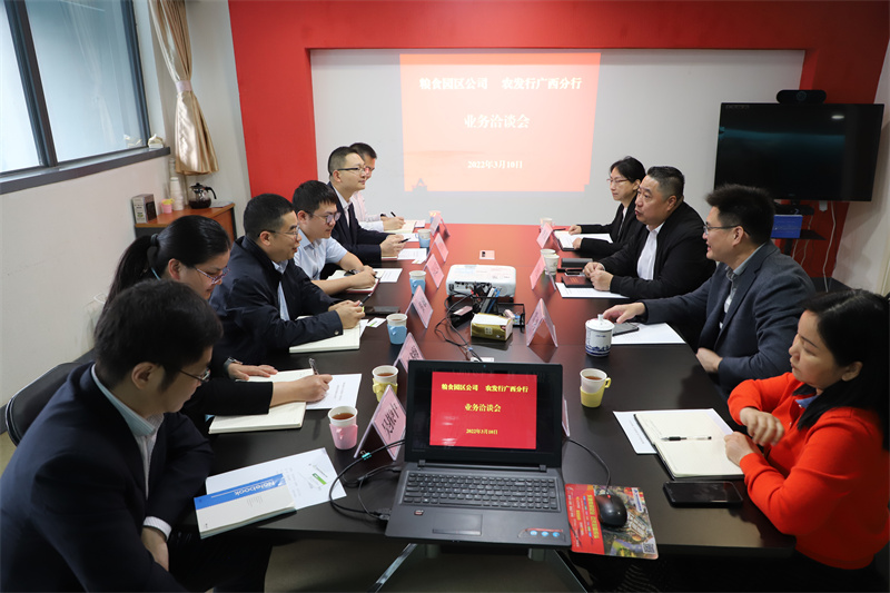 2022年3月10日上午,农发行广西区分行粮棉油与产业客户处处长韦敏率队到粮食园区公司洽谈园区项目物流中心工程建设融资合作事宜