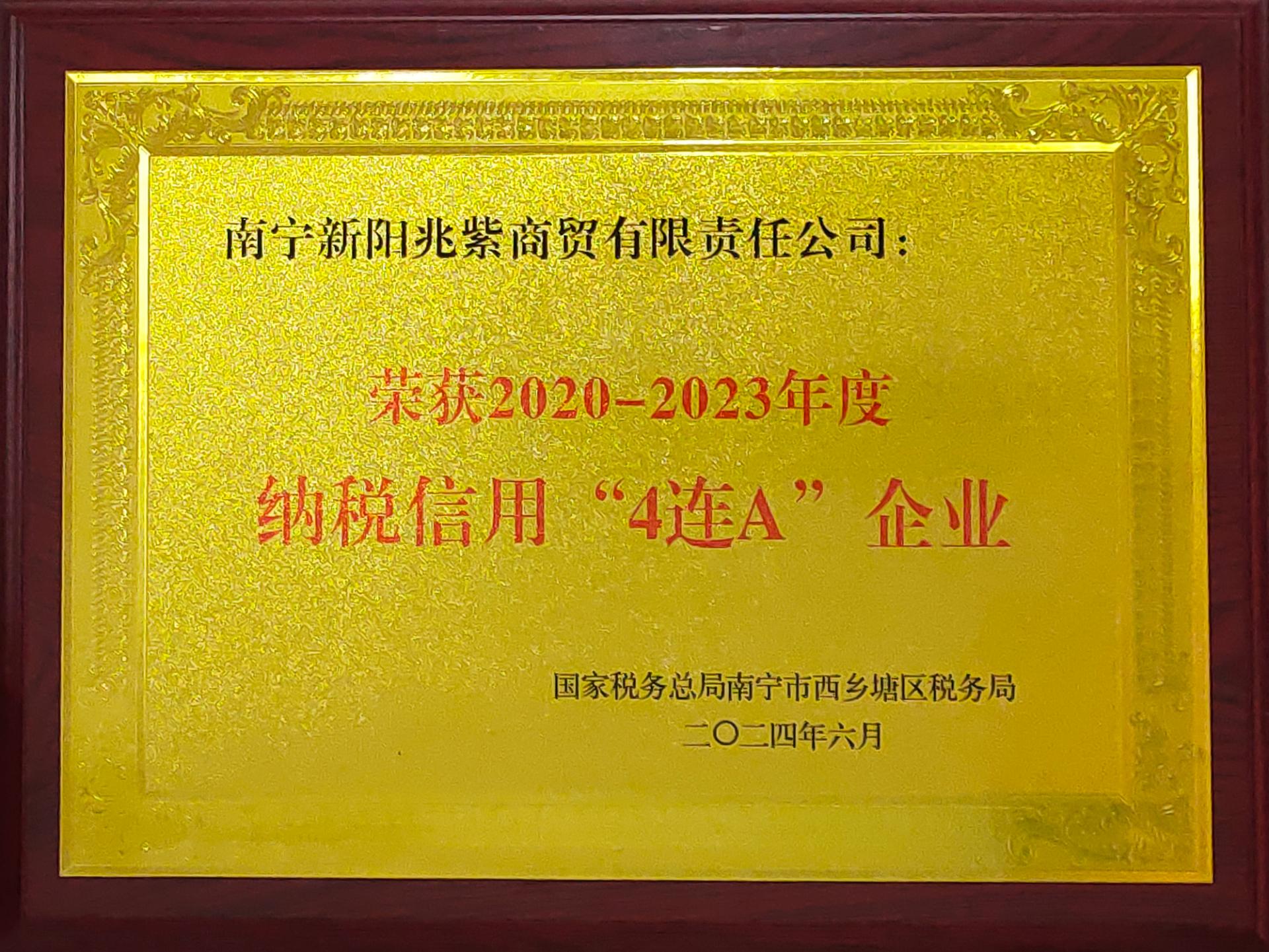 新阳兆紫商贸公司荣获2020-2023年度纳税信用“4连A企业”荣誉称号