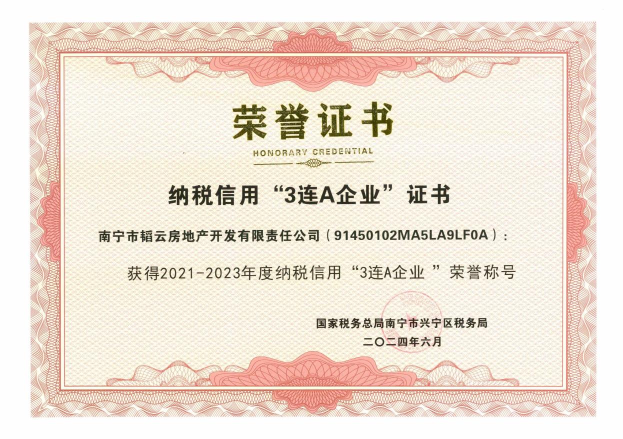近日,乐鱼(中国)房地产开发集团监管单位韬云公司荣获国家税务总局南宁市兴宁区税务局授予2021-2023年度纳税信用“3连A企业”荣誉称号。A级是国家纳税信用评级中的最高级别,“3连A企业”更是代表了税务机关对韬云公司过去3年良好纳税信用的最优评价和肯定。长期以来,公司高度重视税务管理,在日常工作中认真贯彻落实国家税收法律法规和相关制度,采用精细税务管理方式,夯实基础税务数据沉淀工作,依法依规、按时足额申报...