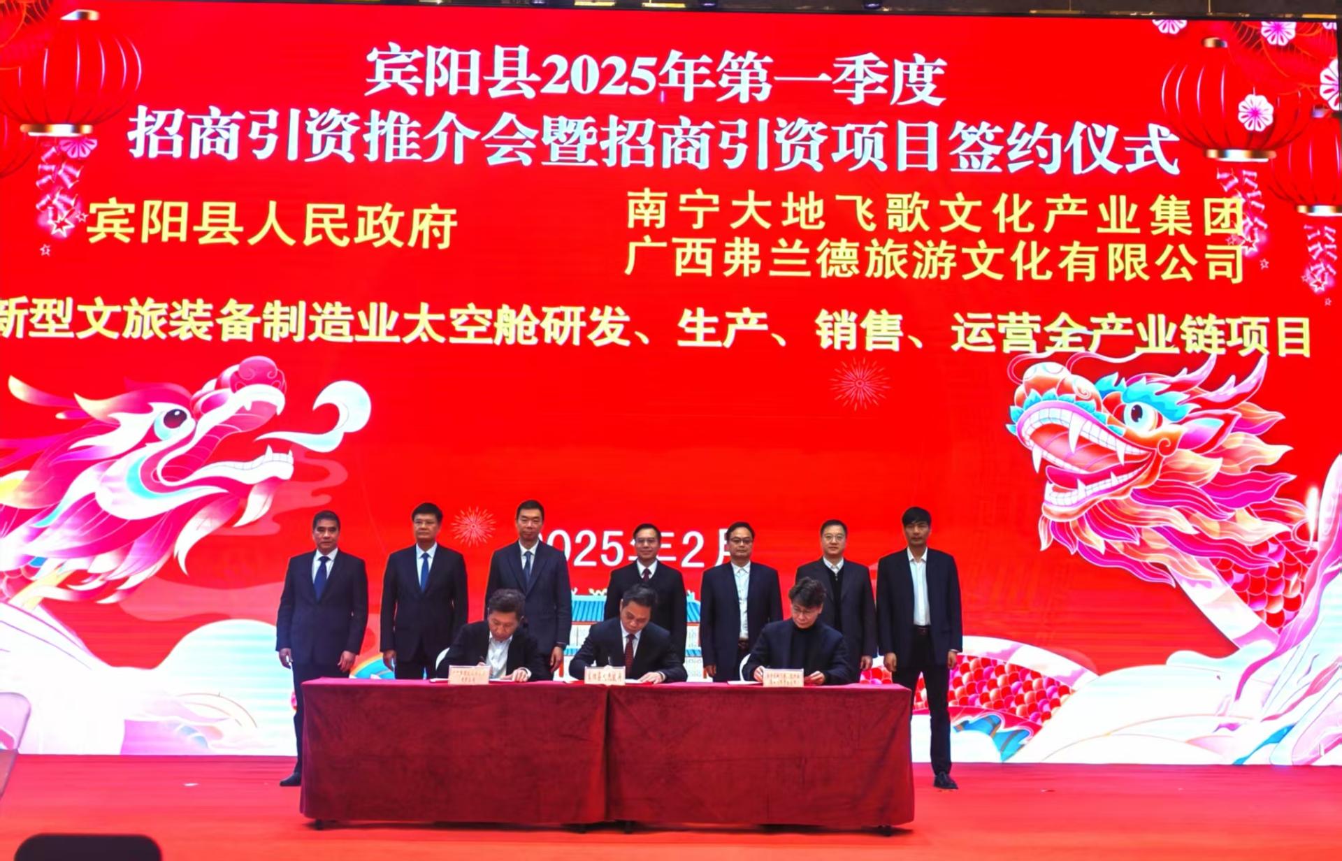 2025年2月8日,南宁大地飞歌集团党委副书记、总经理蔡焕雄带队参加广西南宁市宾阳县2025年第一季度招商引资推介会暨招商引资项目签约仪式。仪式上,集团公司副总经理杨凡代表南宁大地飞歌集团与宾阳县政府、广西弗兰德旅游文化有限公司签订了《新型文旅装备制造业太空舱研发、生产、销售、运营全产业链项目合作框架协议书》。仪式后,蔡焕雄接受记者采访道“今天我们签约的是新型文旅装备制造业——太空舱研发、生产、销售、运...